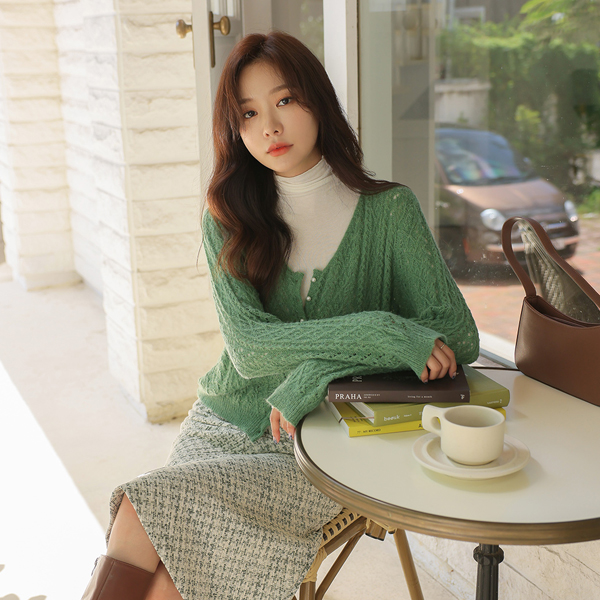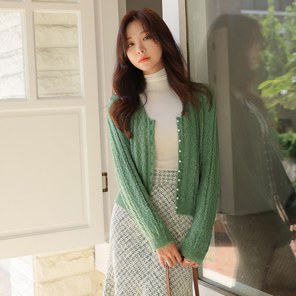 ぽかぽかした 真珠 ポイント すかし ウール カーディガン