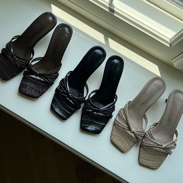 リボン クロス 紐 エンボスレザー 革 サンダル ヒール