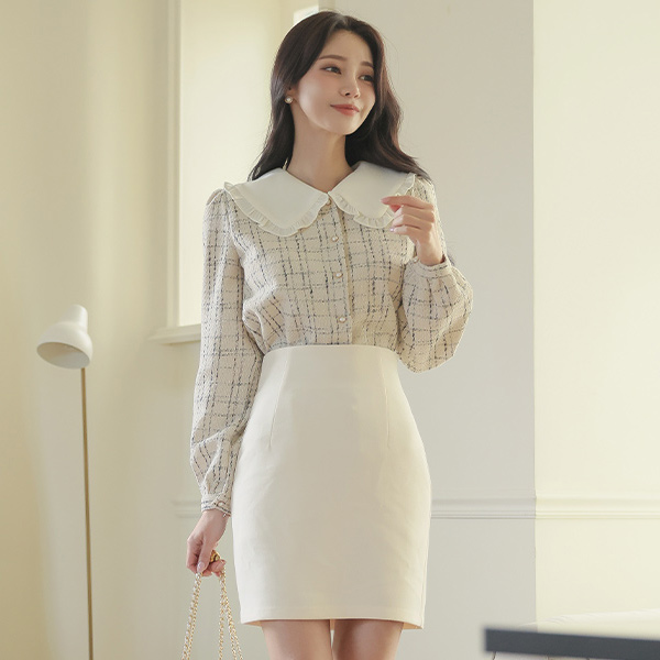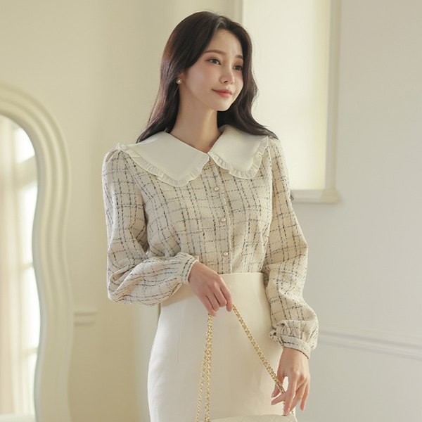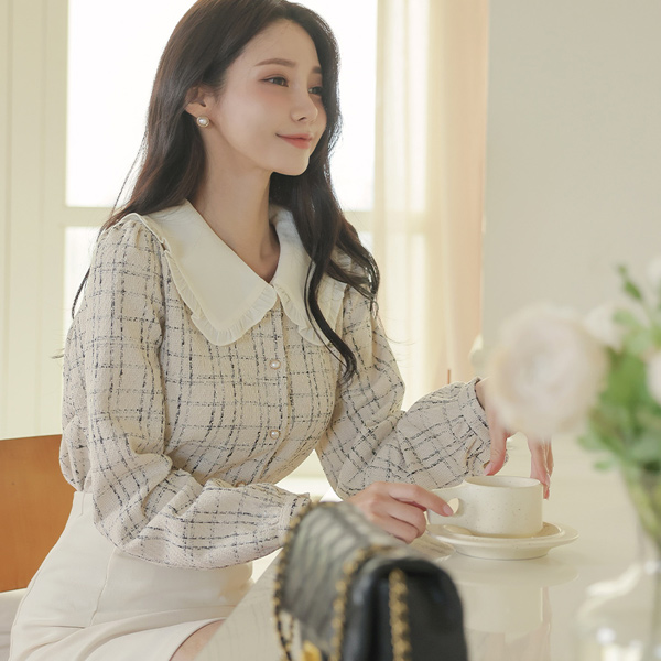 フリル カラー ツイード 真珠 ブラウス