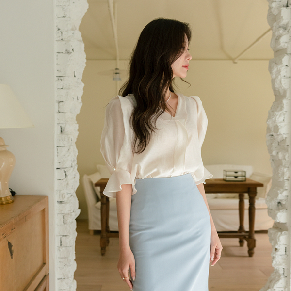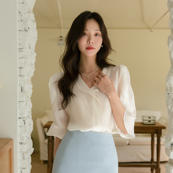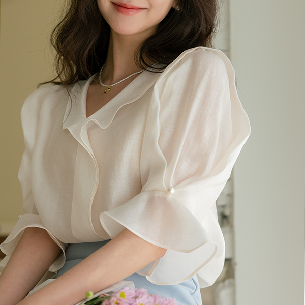 ロマンチック ラッフル ポイント フルライン 袖 真珠 ブラウス