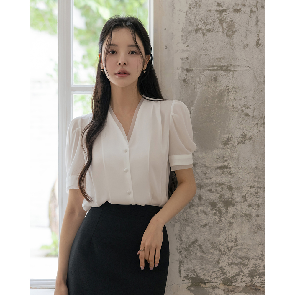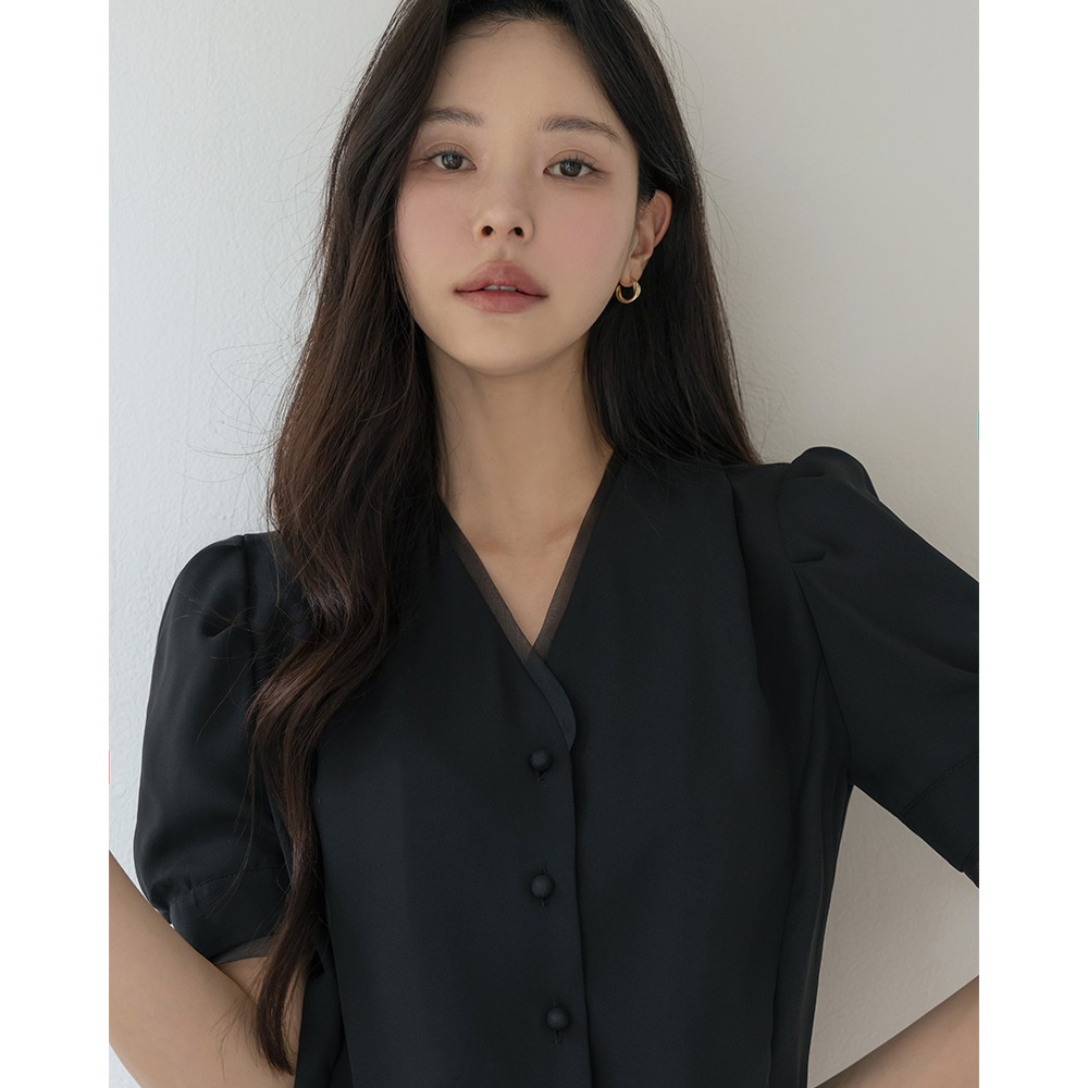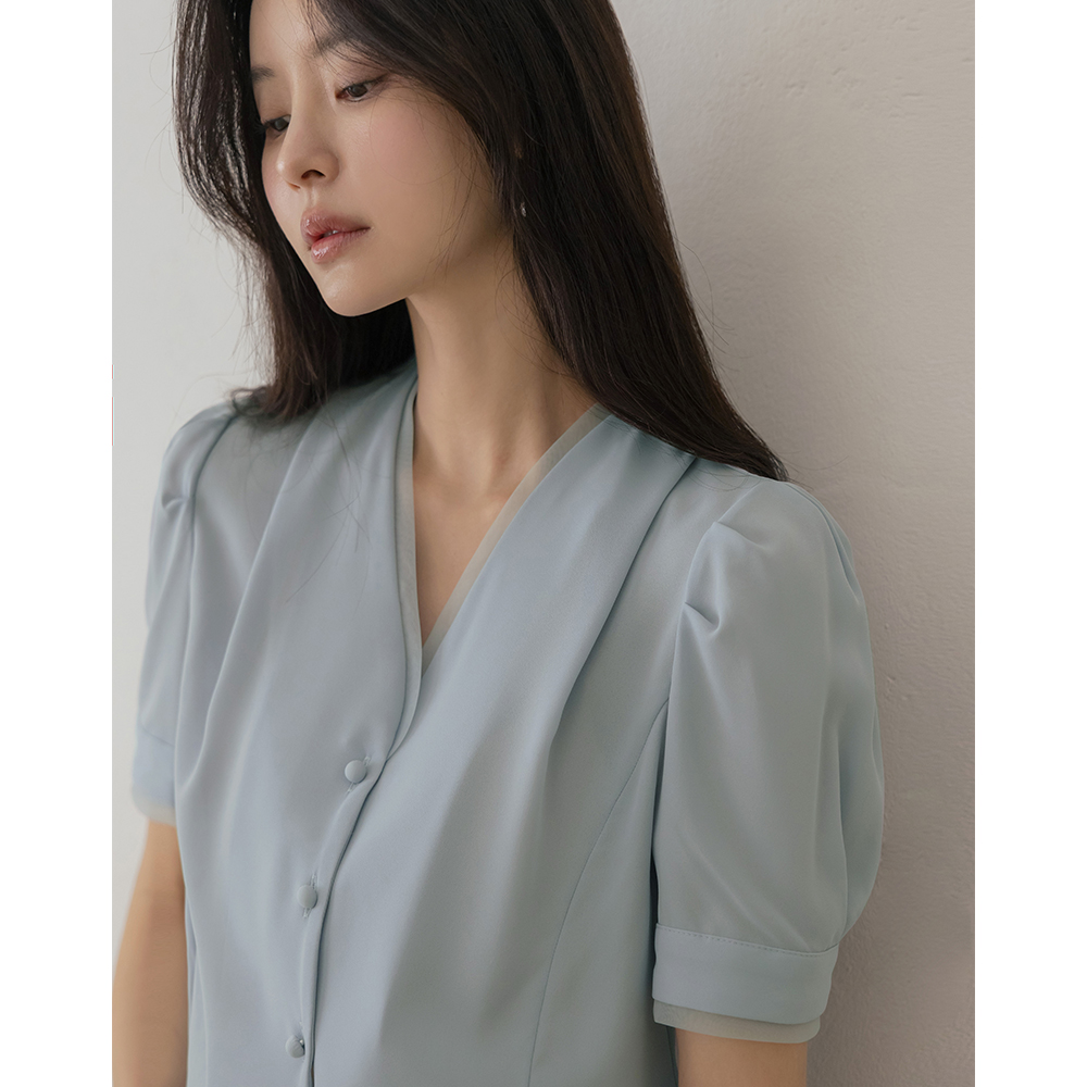 オーガンザ 配色 裏地 ピンタック パフ袖 ブラウス