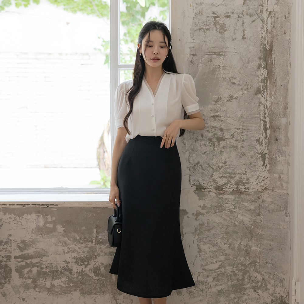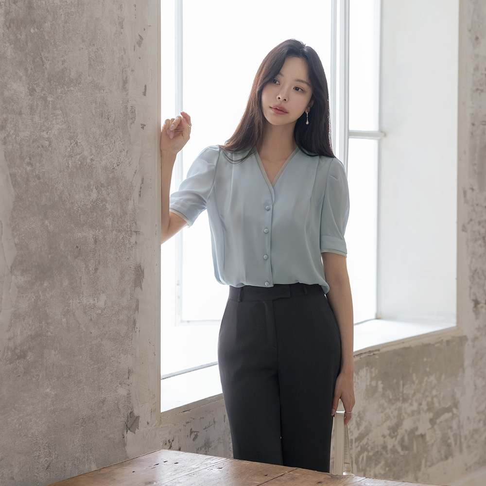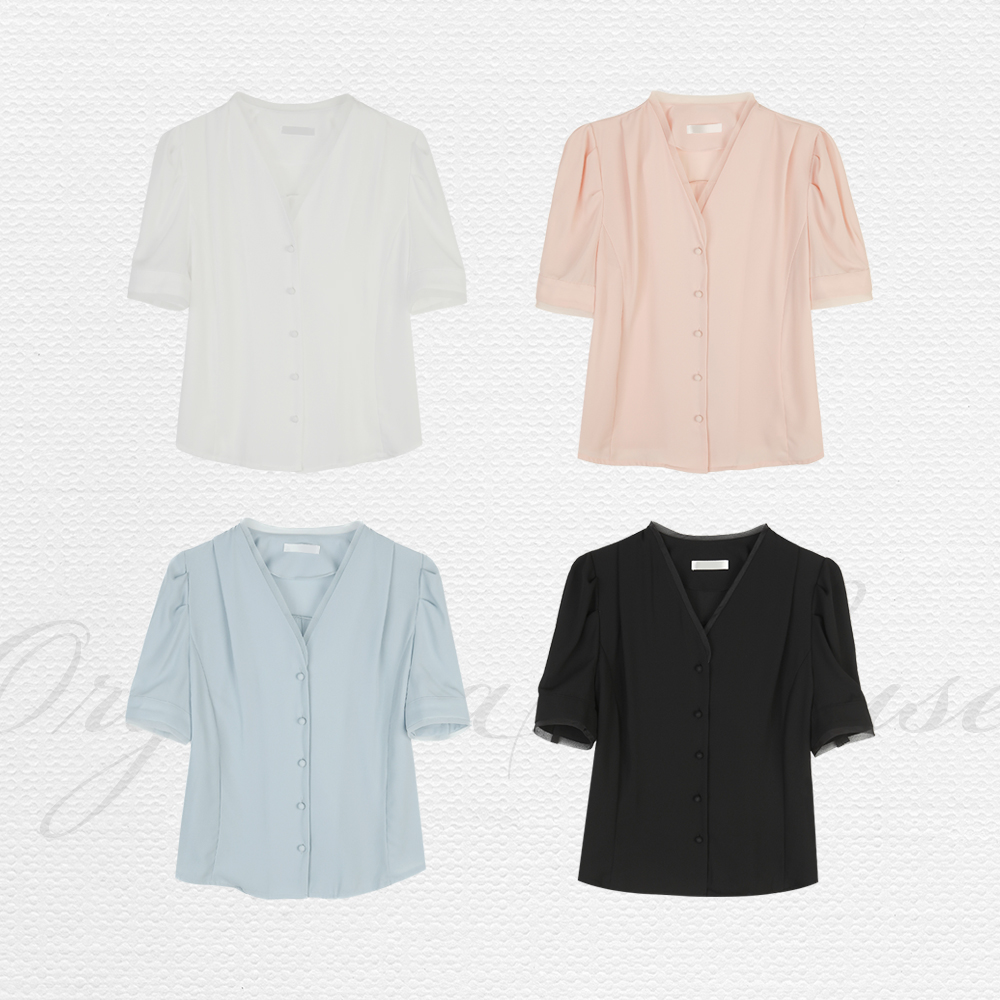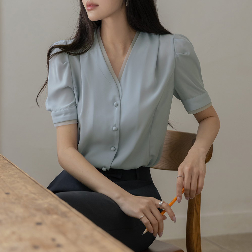 オーガンザ 配色 裏地 ピンタック パフ袖 ブラウス