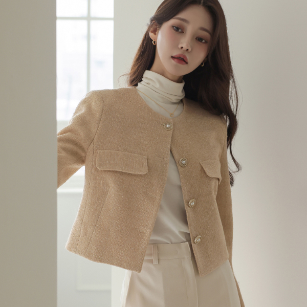 Prime ラウンドネック ゴールド 真珠 ボタン ツイード ジャケット