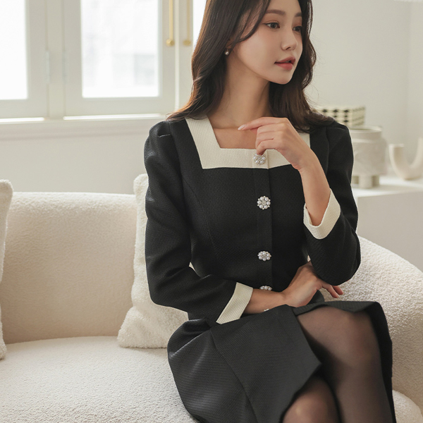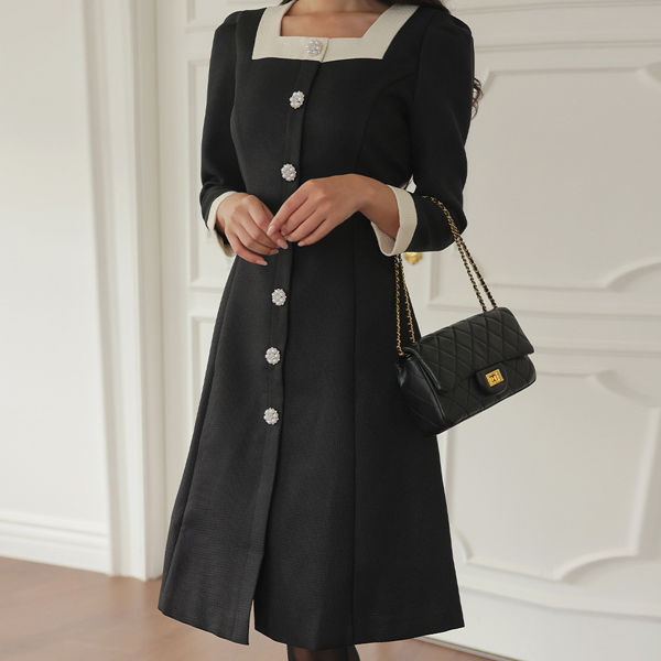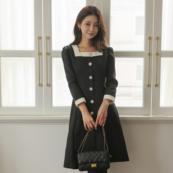 ロマンチック スクエアネック 配色 真珠キュービック ボタン ツイード ワンピース