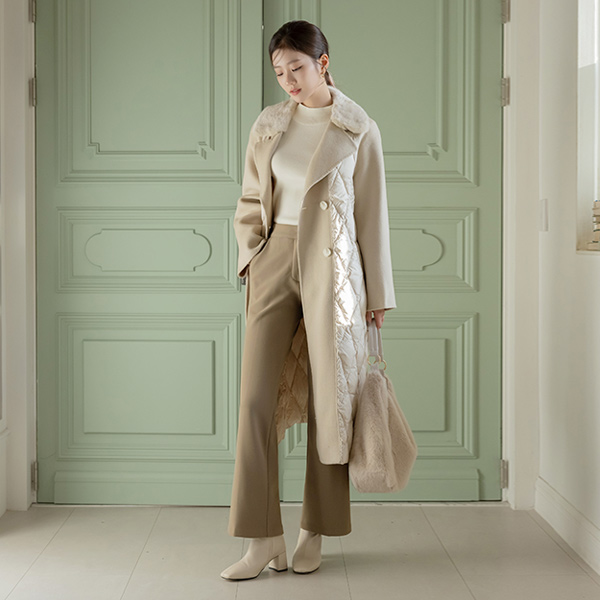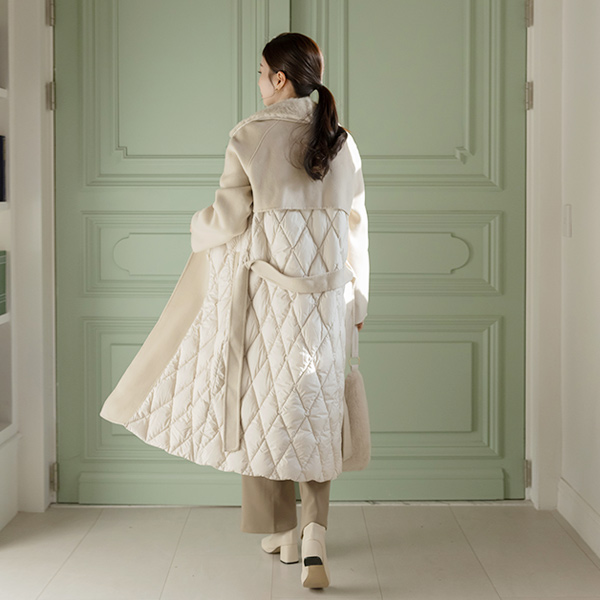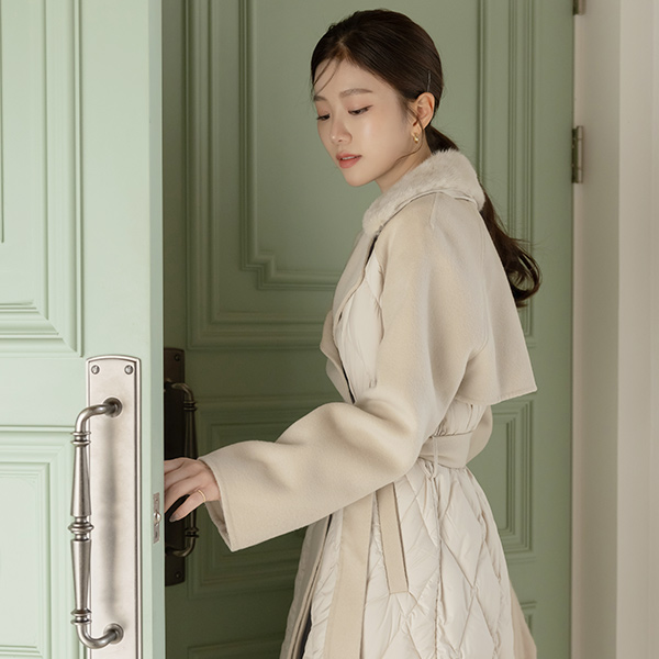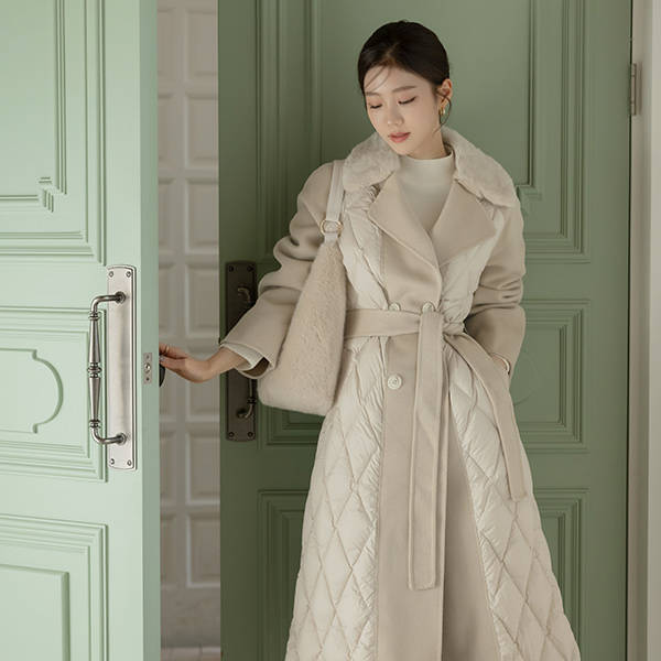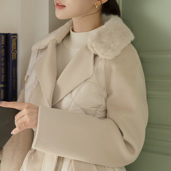 ミンクファー カラー グース 配色 バディング ウール ベルティード ロング コート