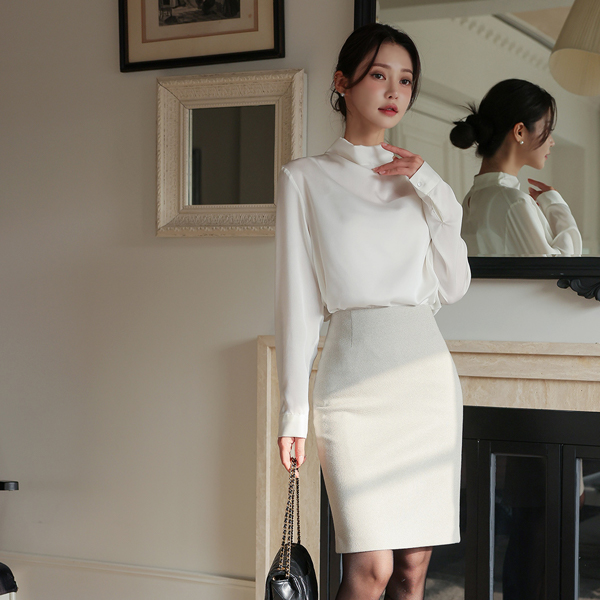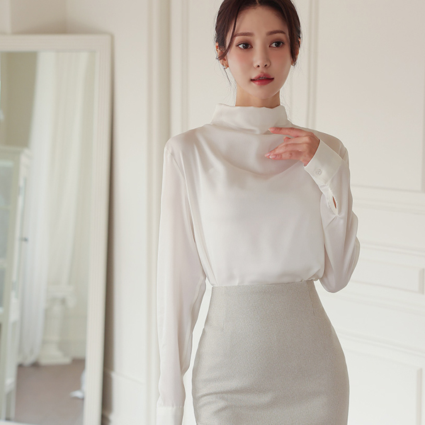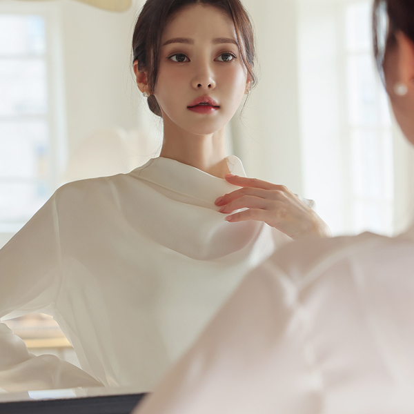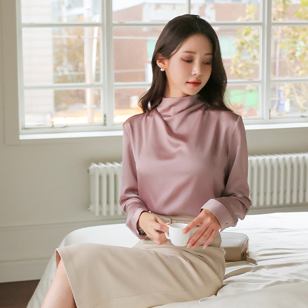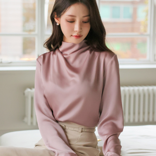 サテン ハーフネック ドレープ ブラウス