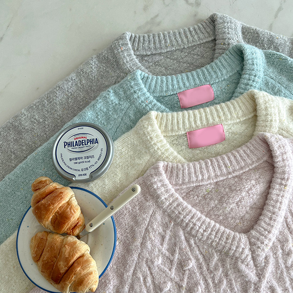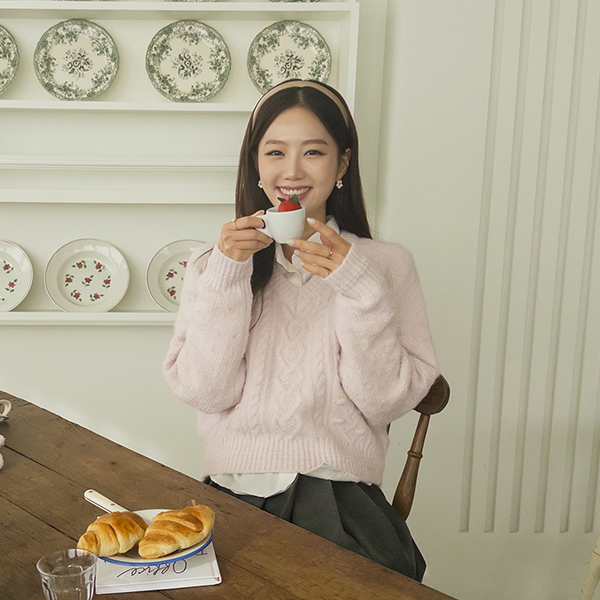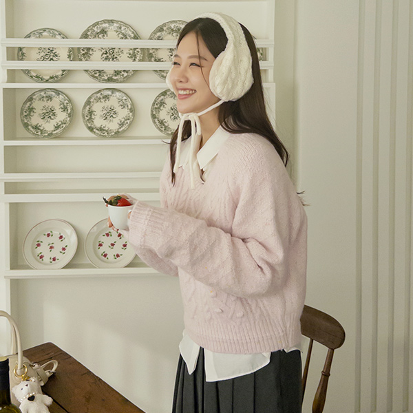 ケーブル ポンポン パタン シュガー ブイネック ウール ニット