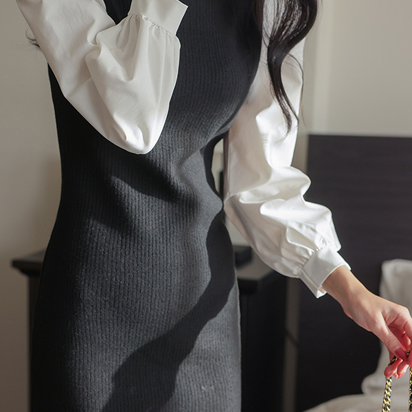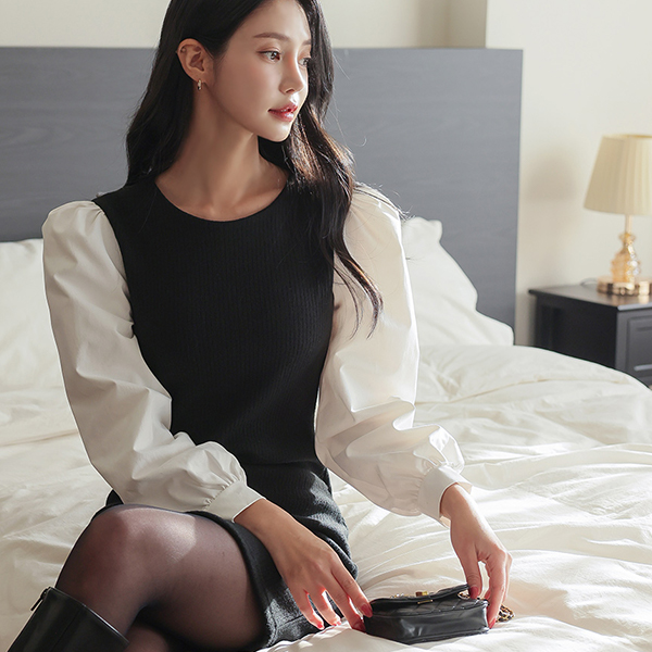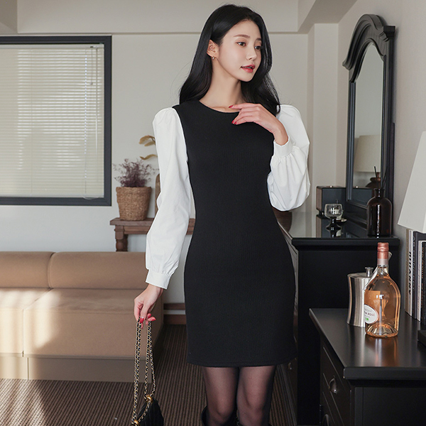 パフ 袖 ニット 配色 スリム ミニ ワンピース