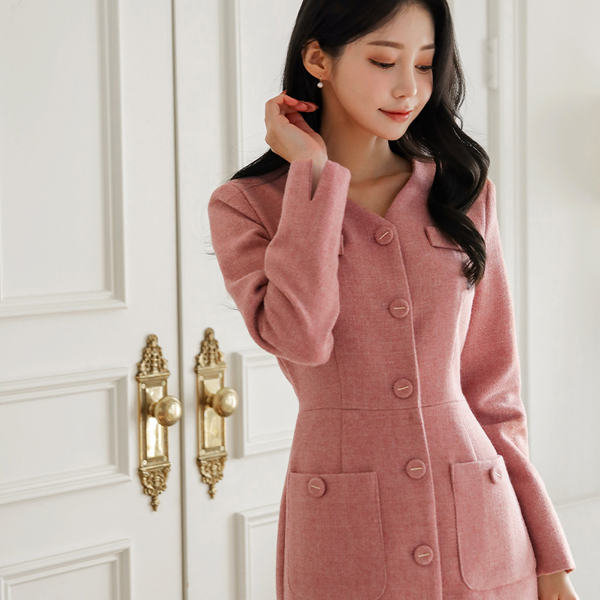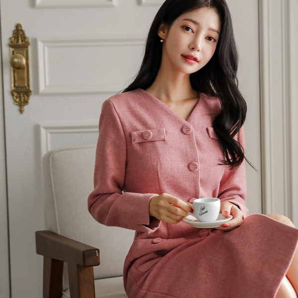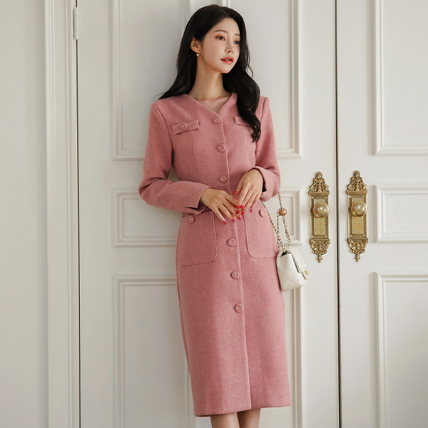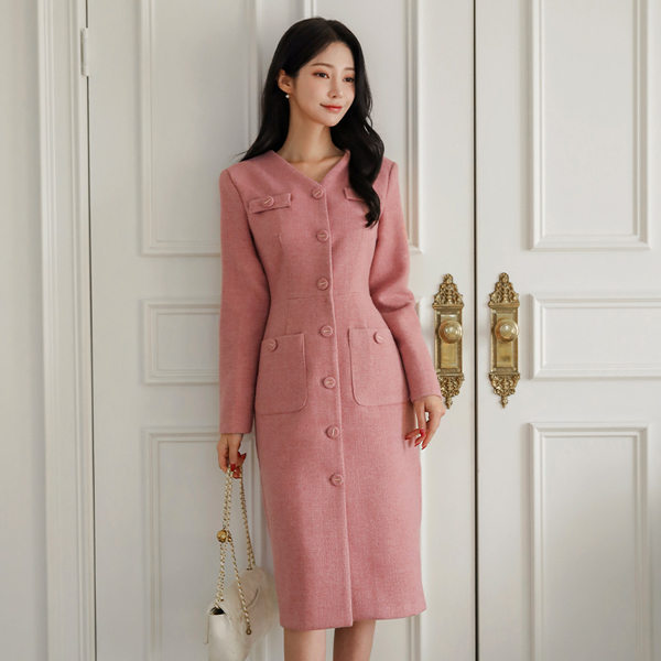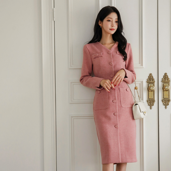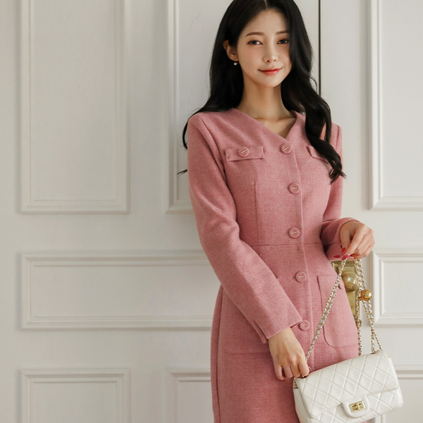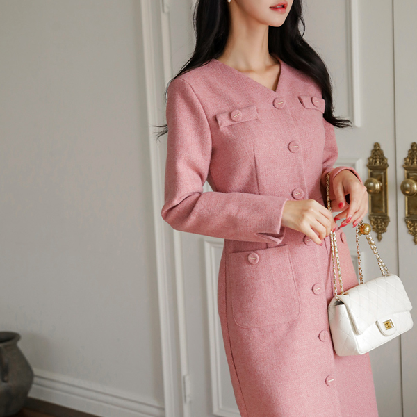 메이핀 ブイネック ツイード Hライン ウール ワンピース