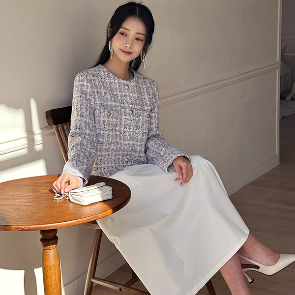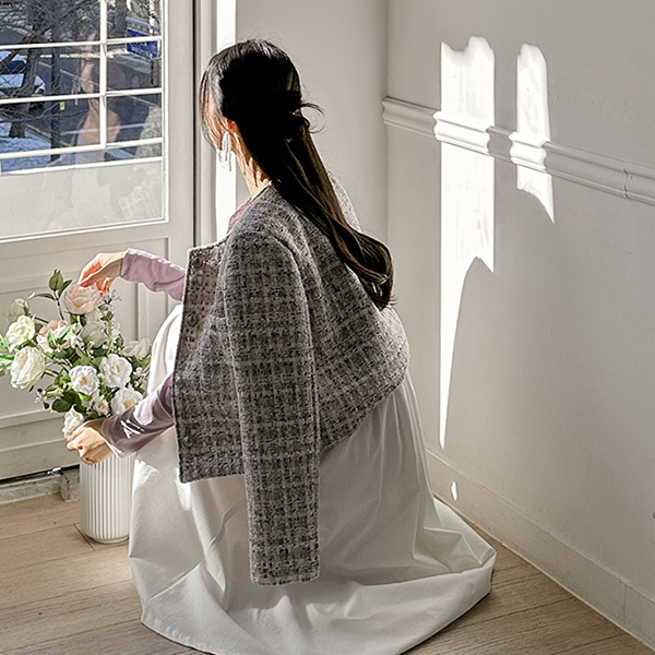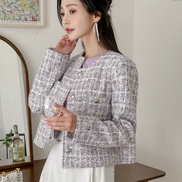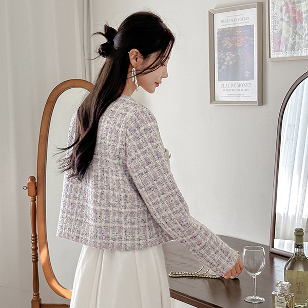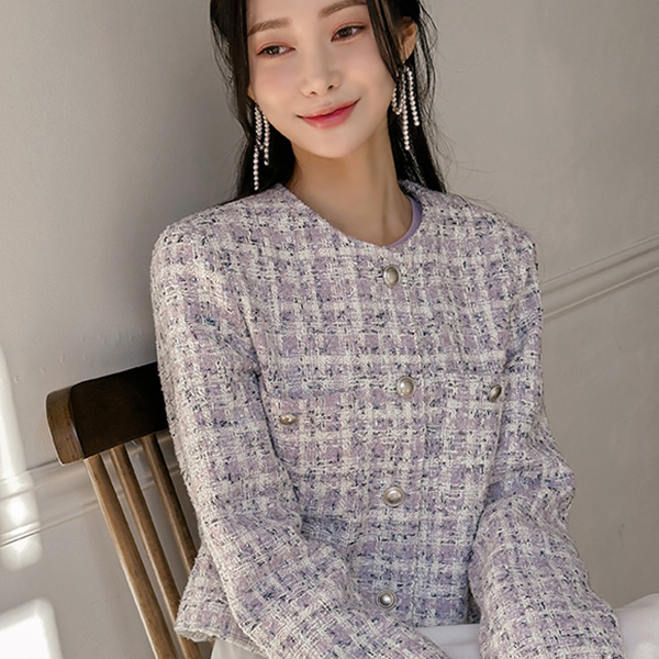 チェック ツイード ラウンドネック Silver ボタン ジャケット