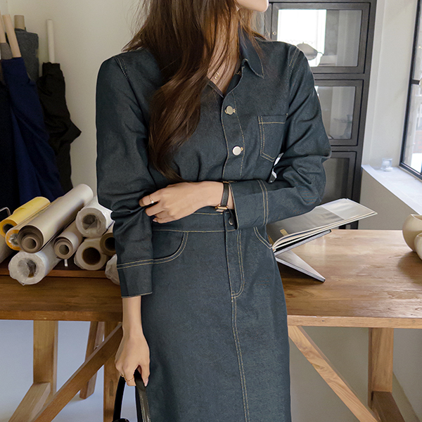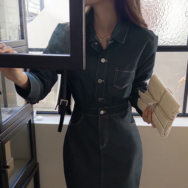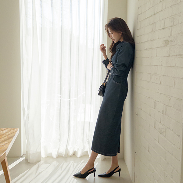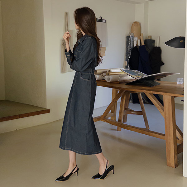 크로플 後面バンド 生地 デニム ロング ワンピース