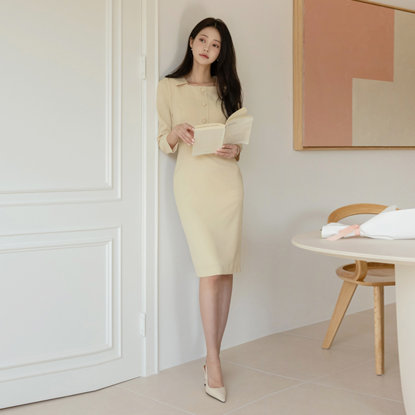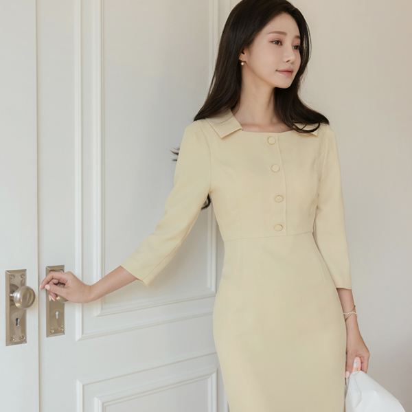 スクエア カラーネック ボタン ポイント スリム ワンピース