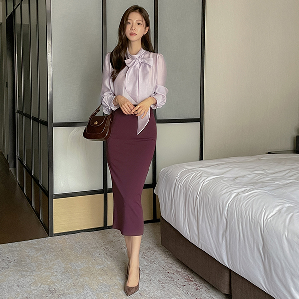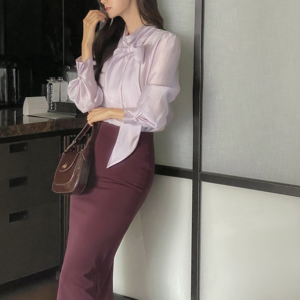 エレガンス リボン セミハイネック 真珠 袖 ブラウス