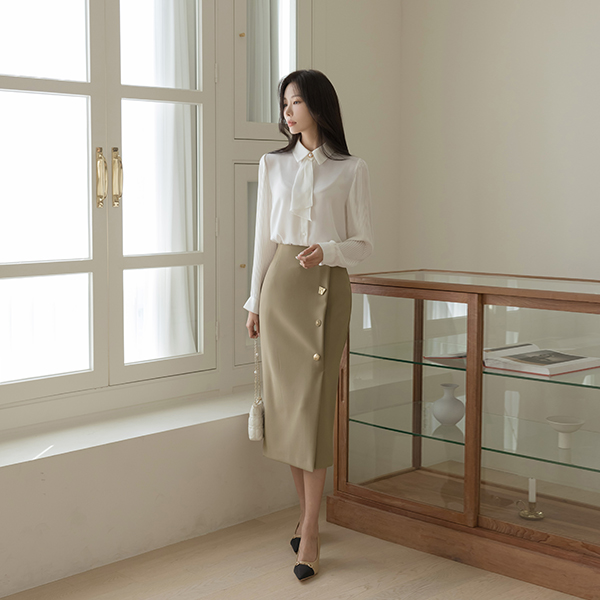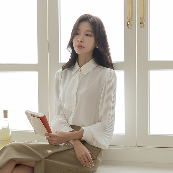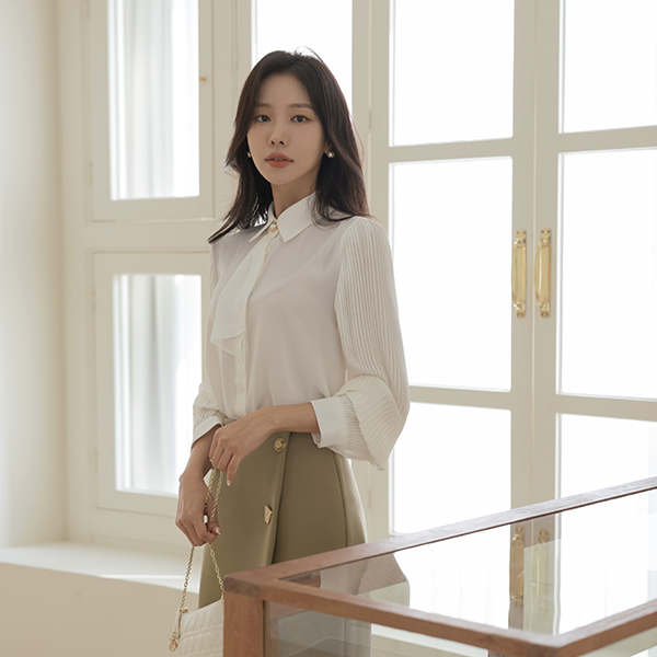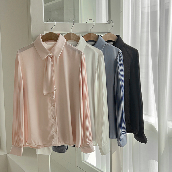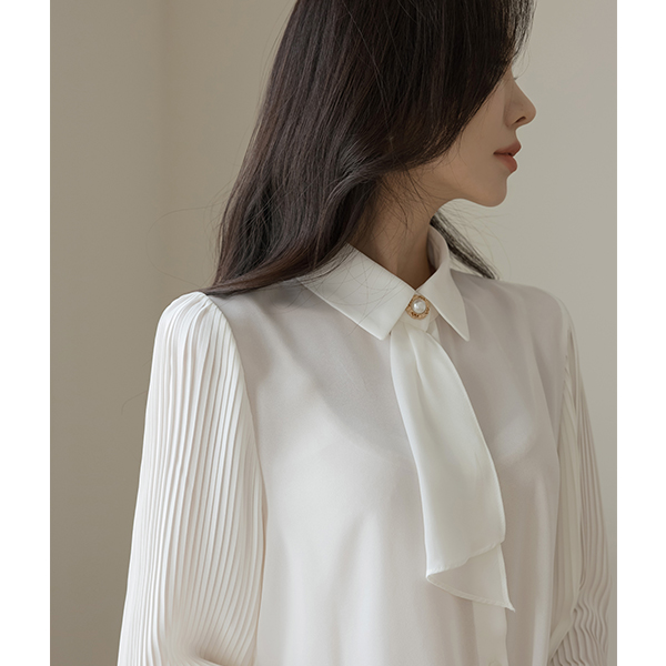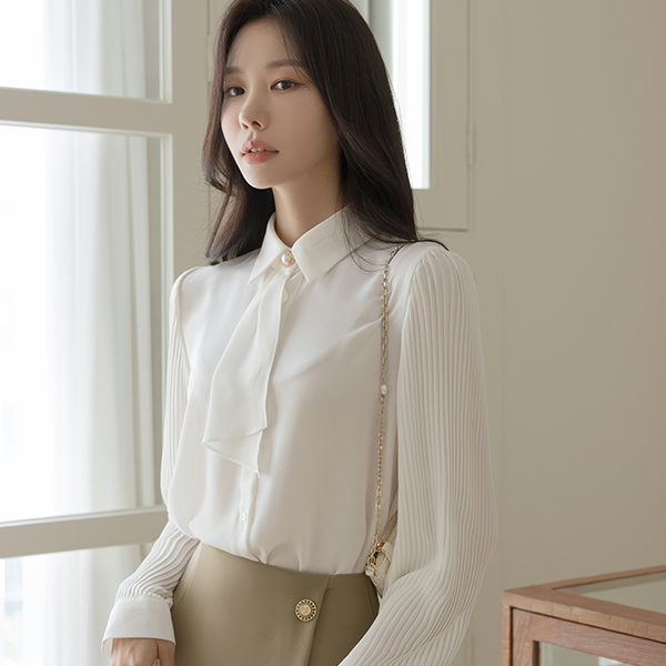 プリーツ 袖 真珠 탑버튼 タイ ブラウス