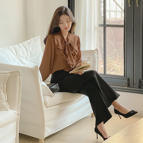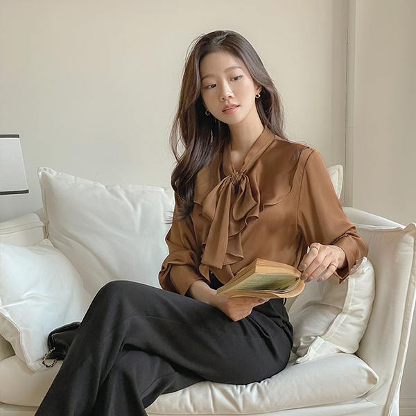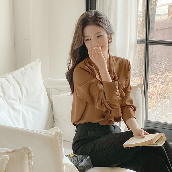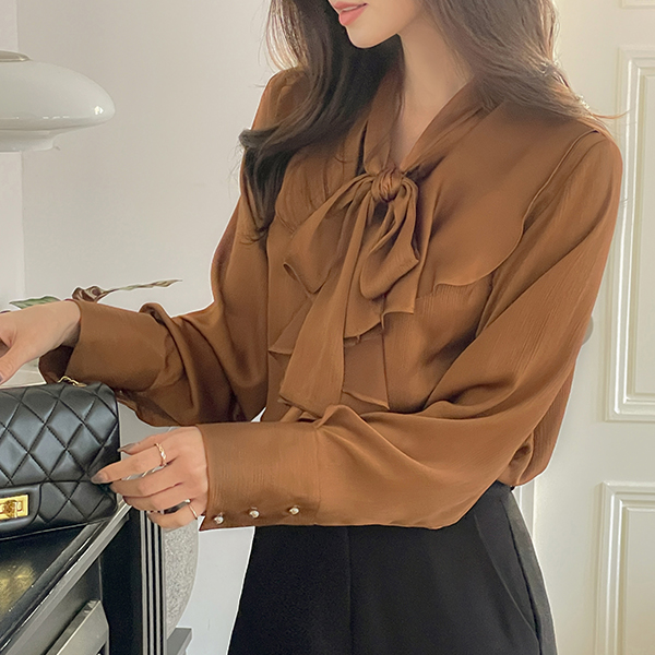 エレガンス フリル サテン タイネック ブラウス