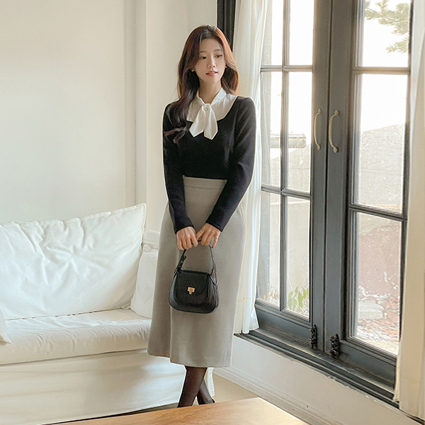 配色 真珠 タイネック レイヤード ニット