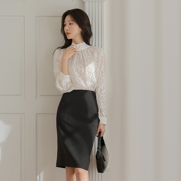 디오 シースルー レイス タイネック ブラウス