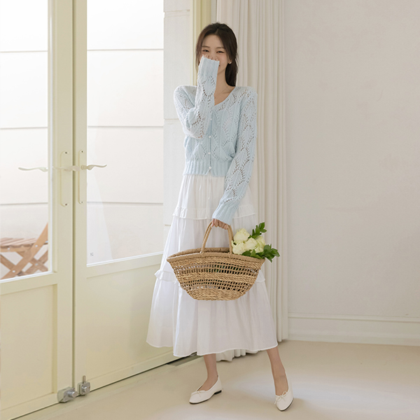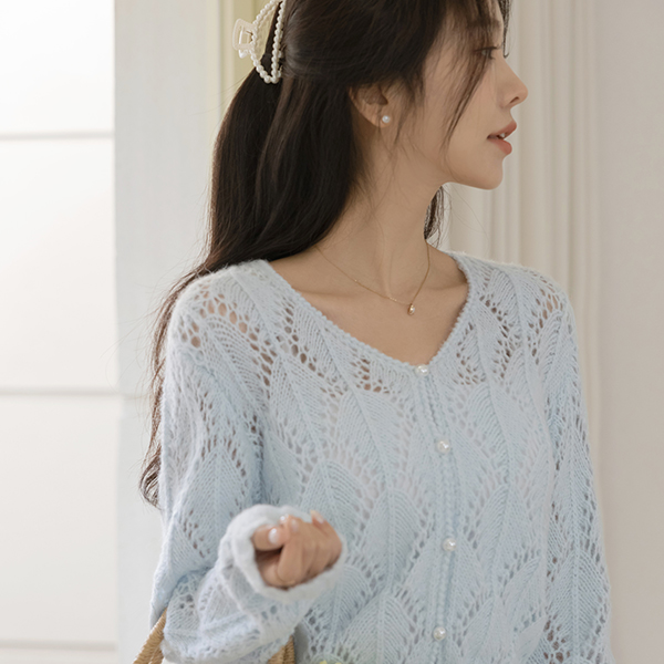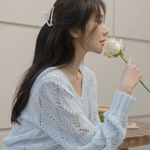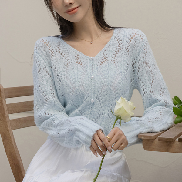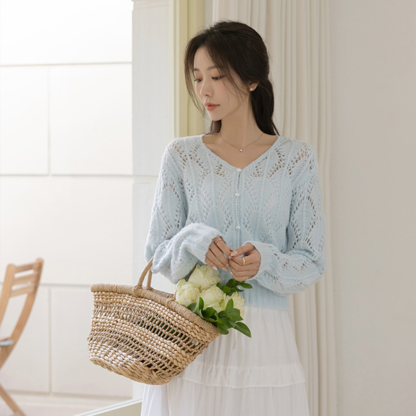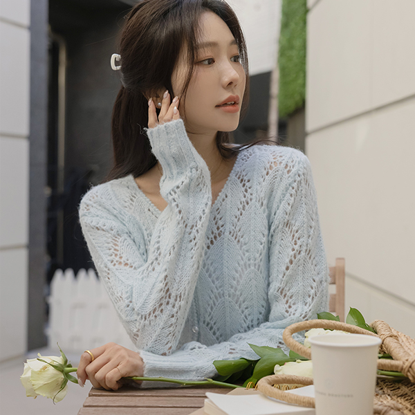 ラブリー パンチング ウール ブイネック カーディガン