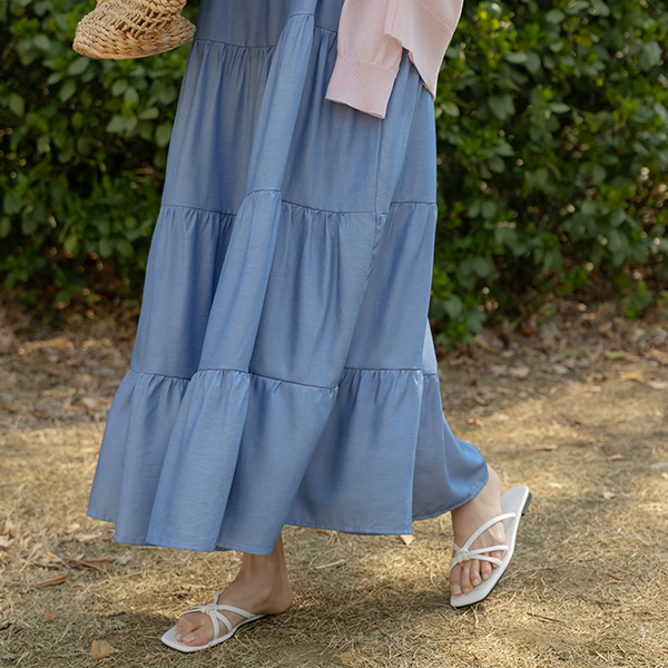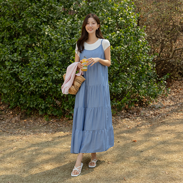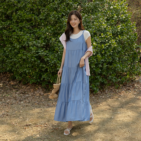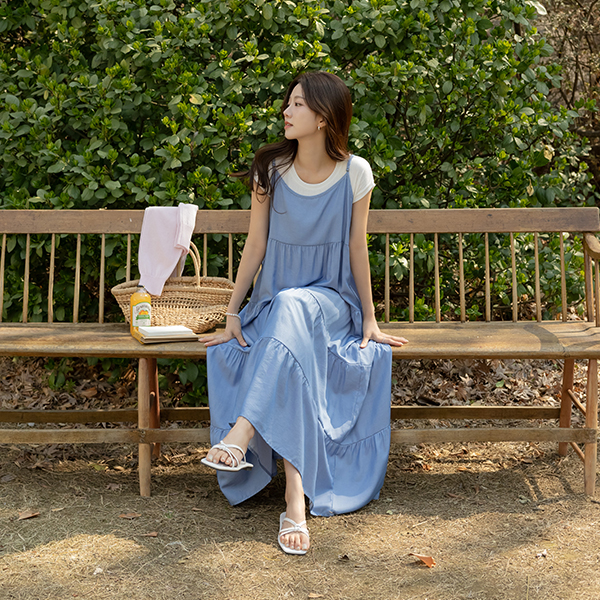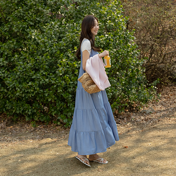 ピクニック カンカン 袖なし ロング デニム ワンピース