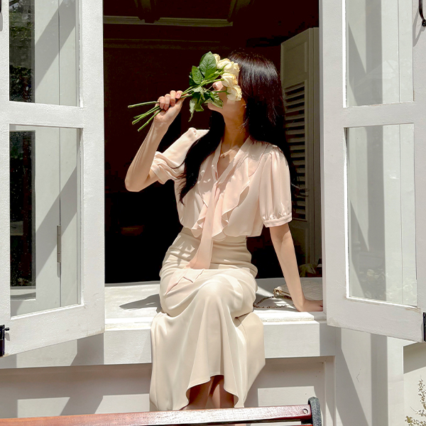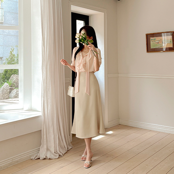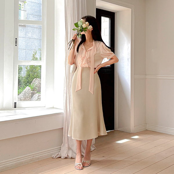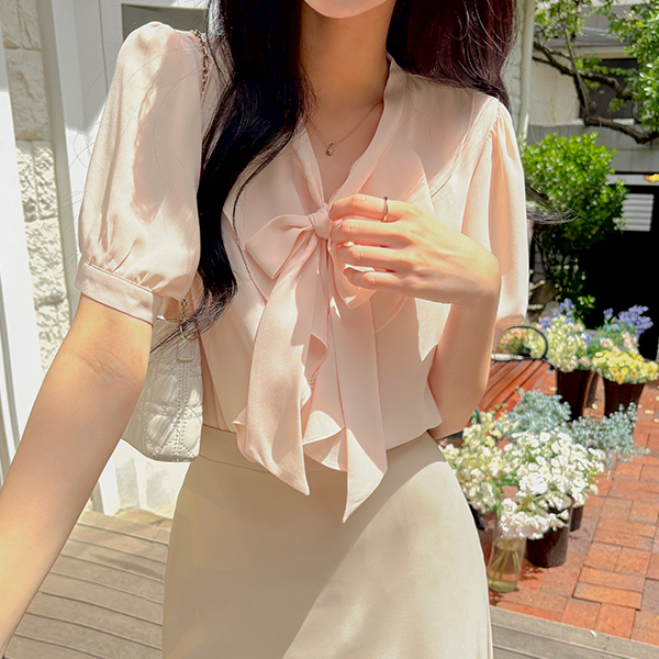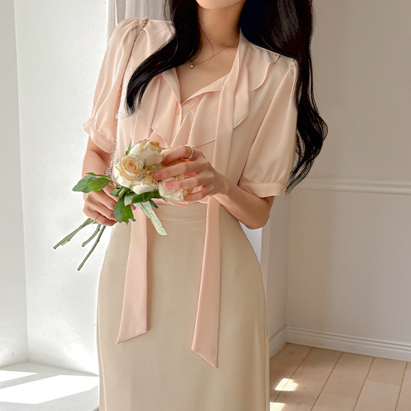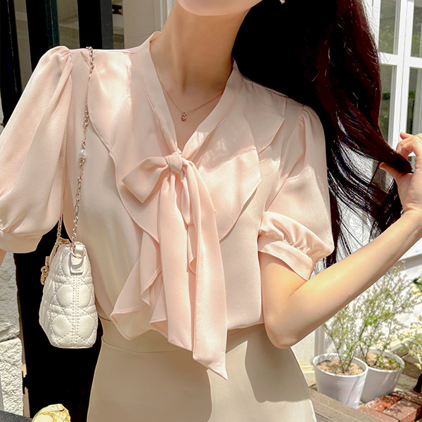 ソフト ラッフル カラー タイネック パフ ブラウス