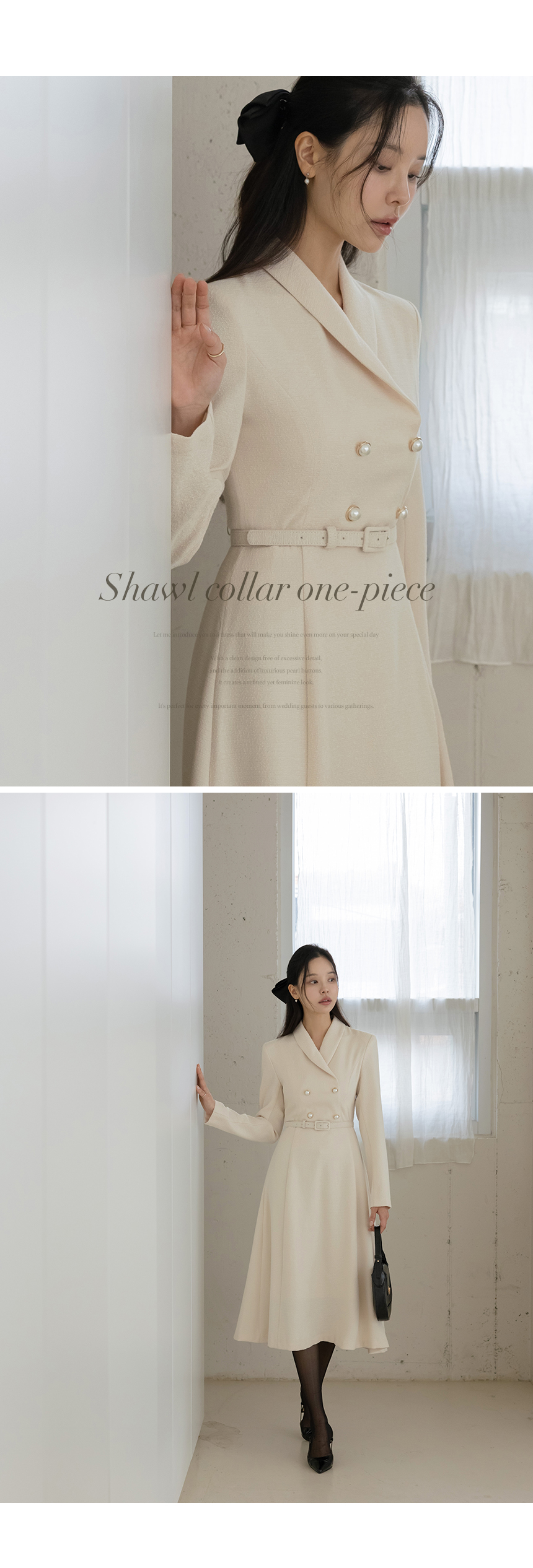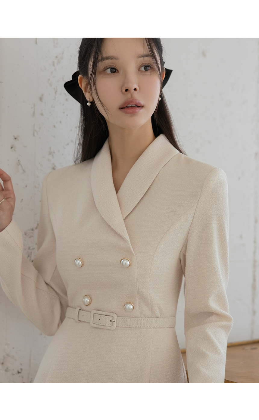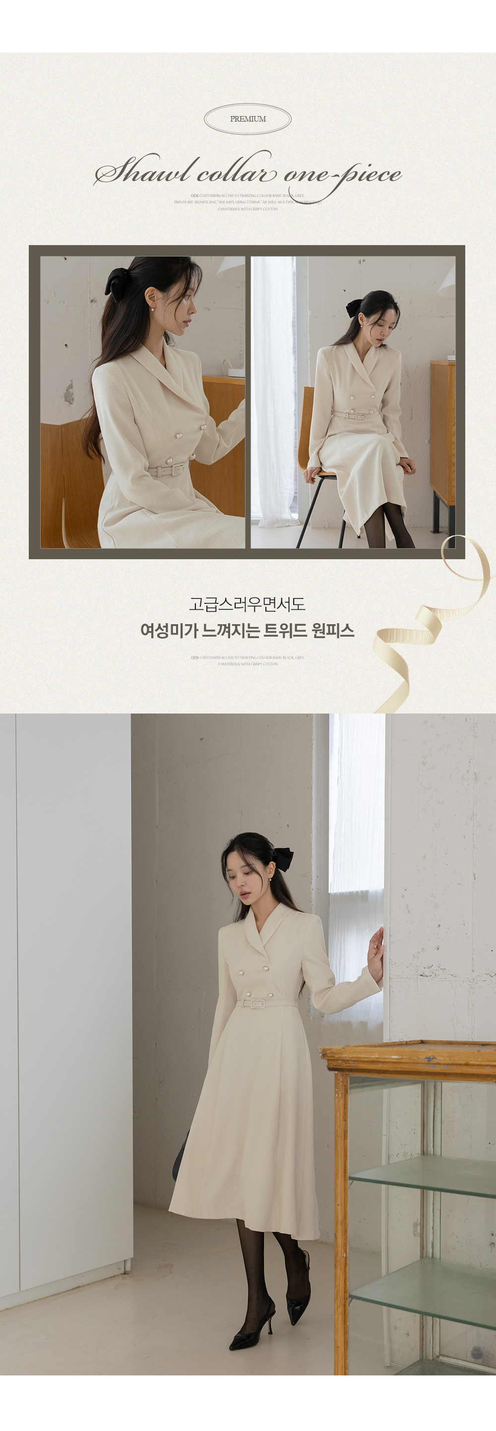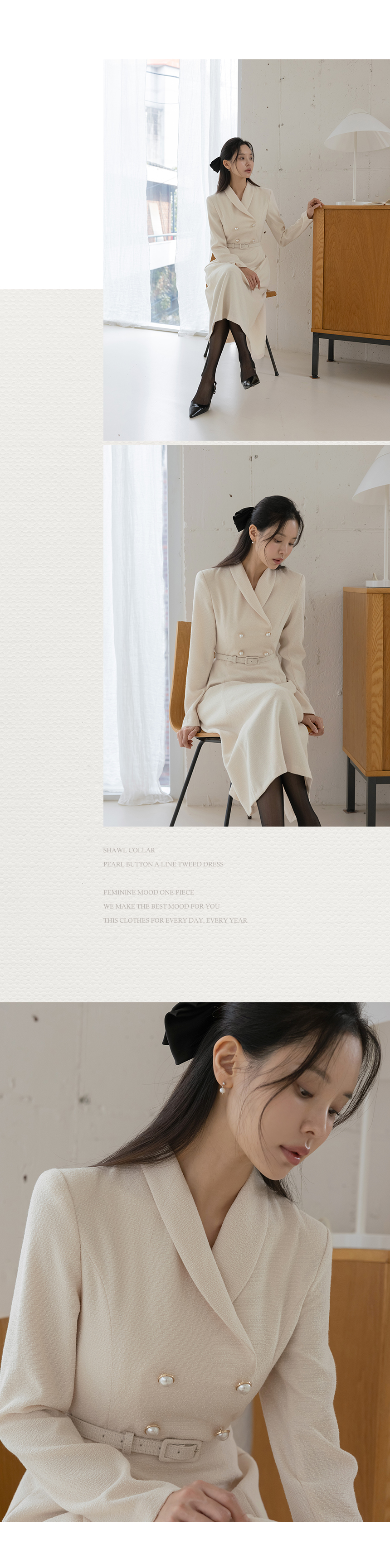 ショールカラー 真珠ボタン Aライン ツイード ワンピース(+ベルト)