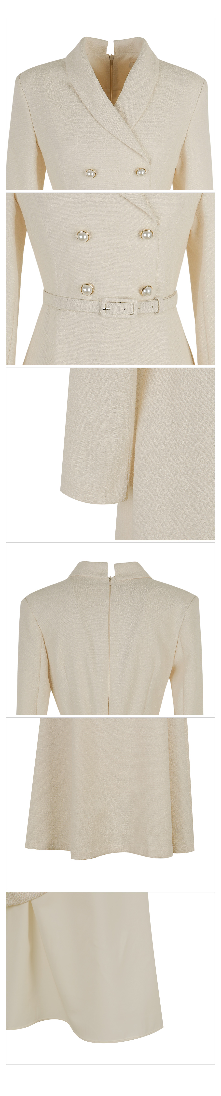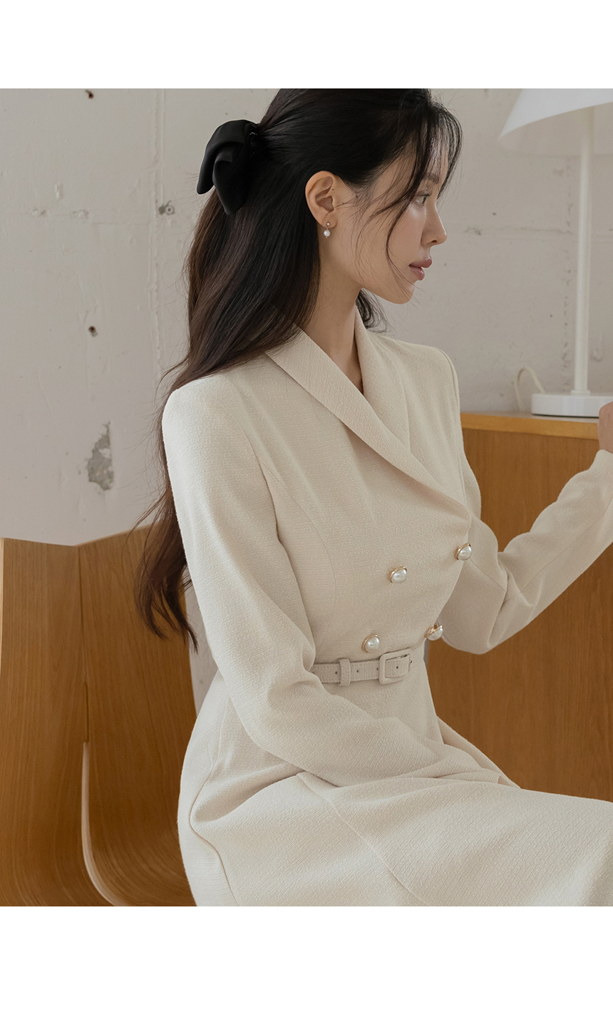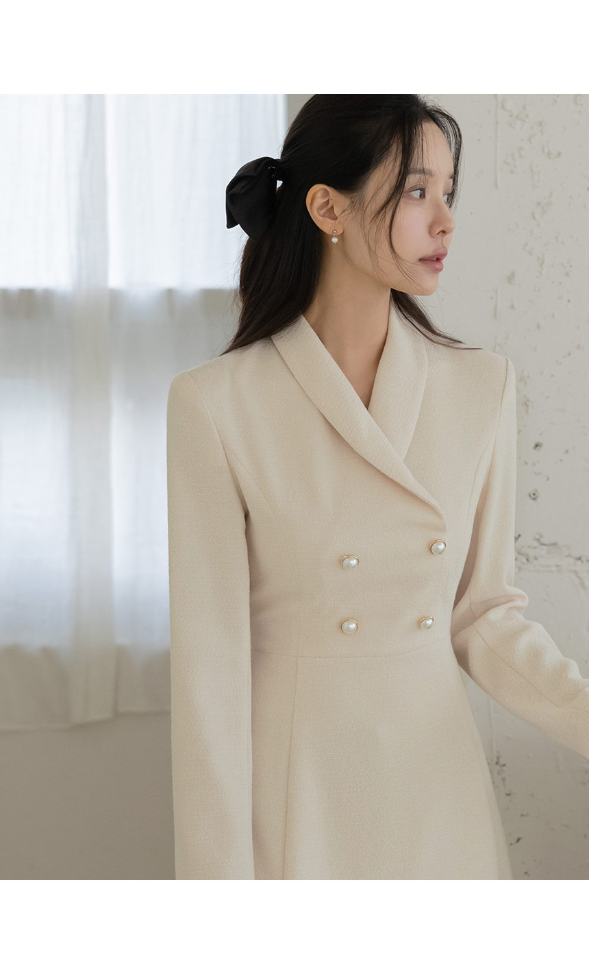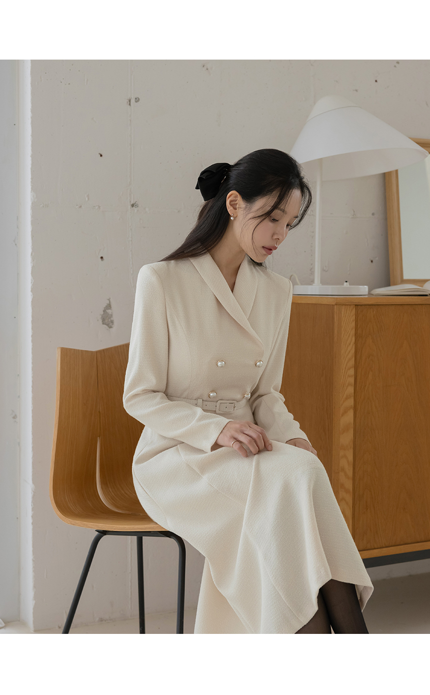 ショールカラー 真珠ボタン Aライン ツイード ワンピース(+ベルト)