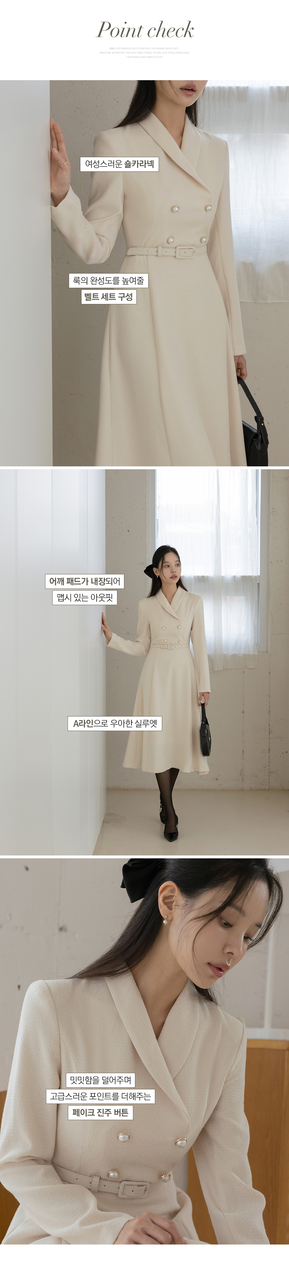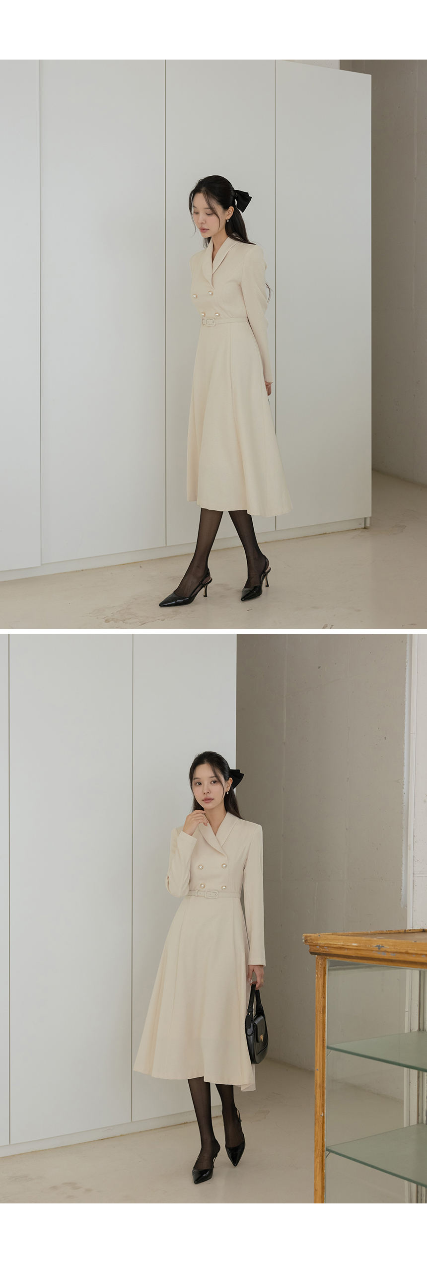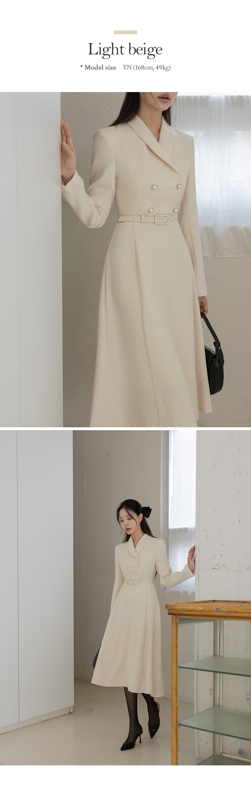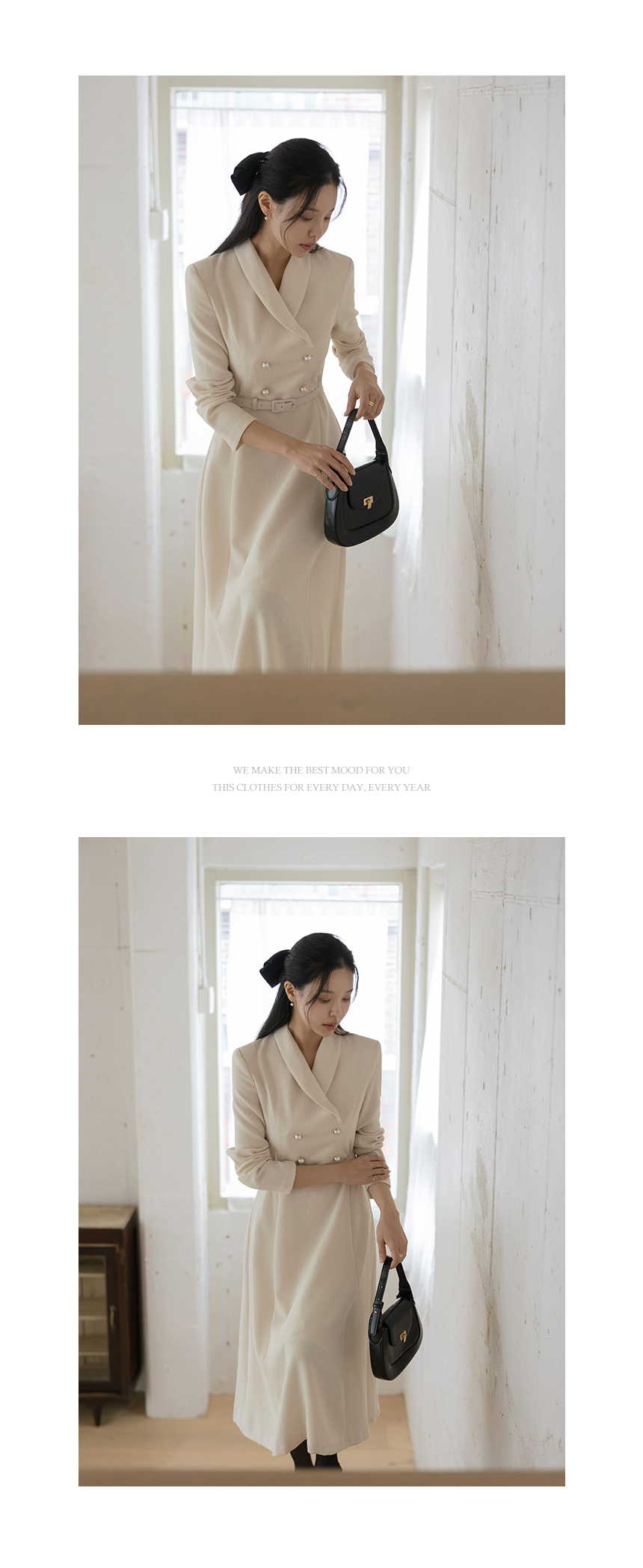 ショールカラー 真珠ボタン Aライン ツイード ワンピース(+ベルト)