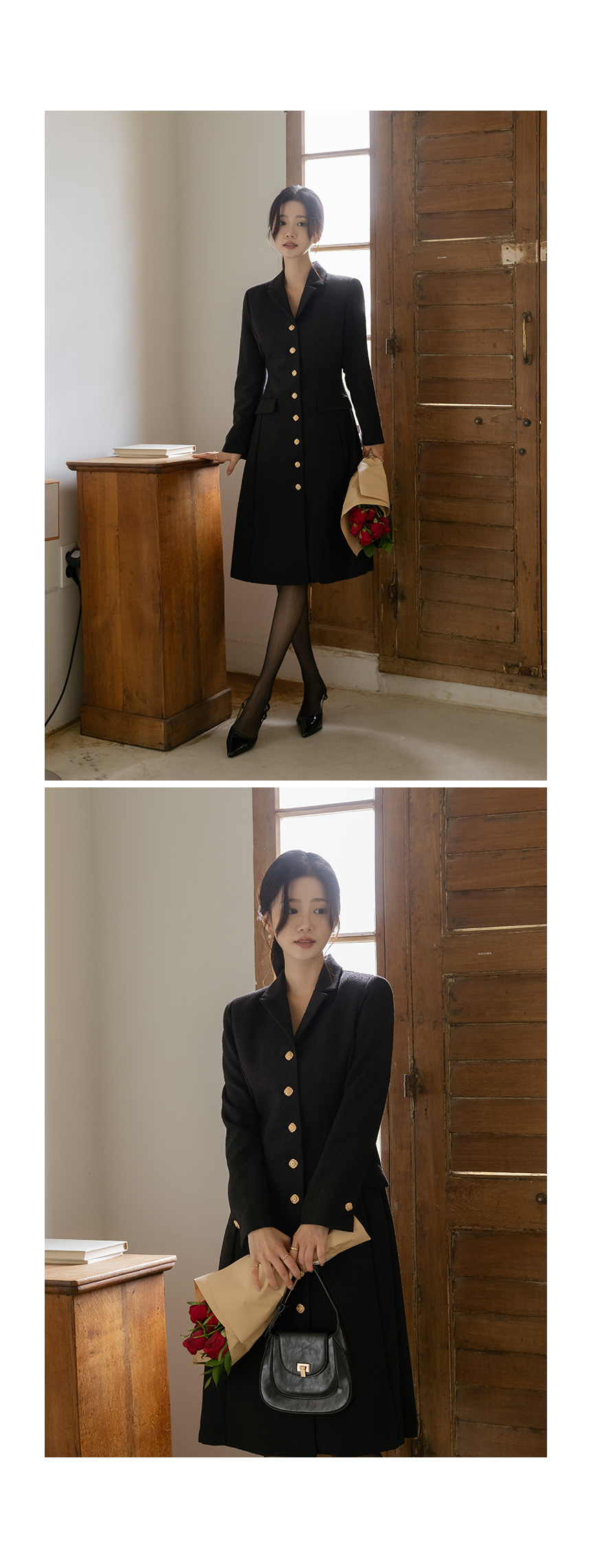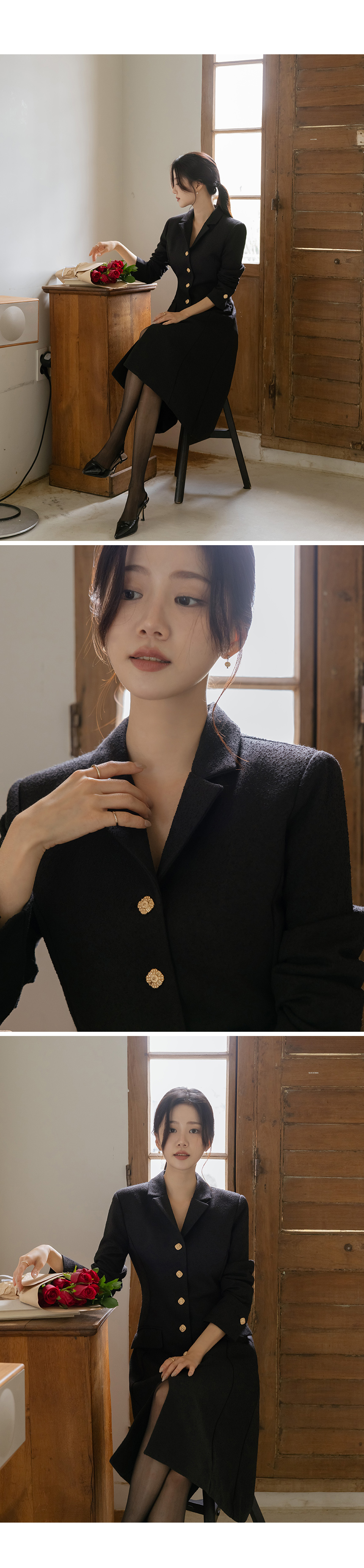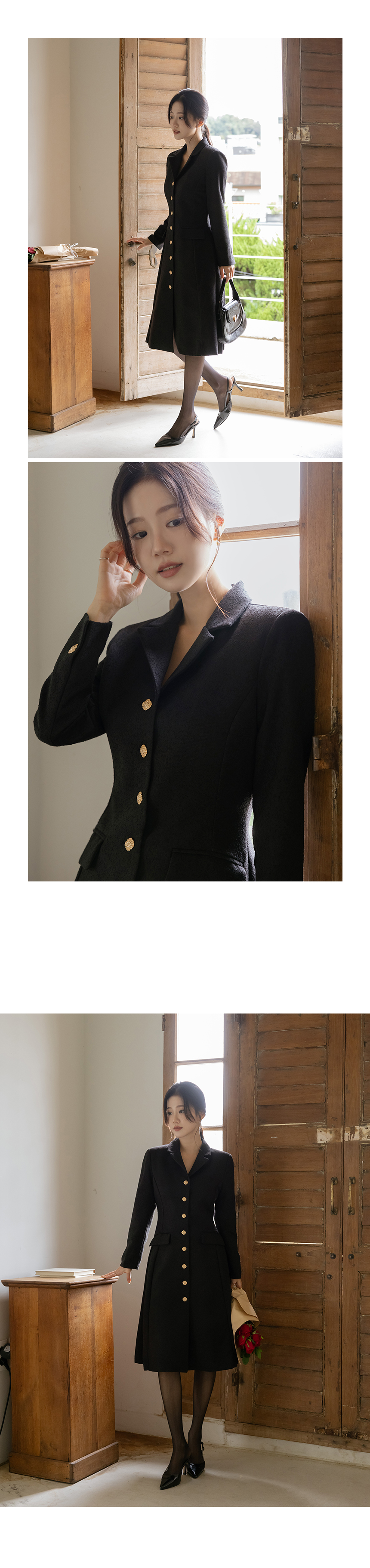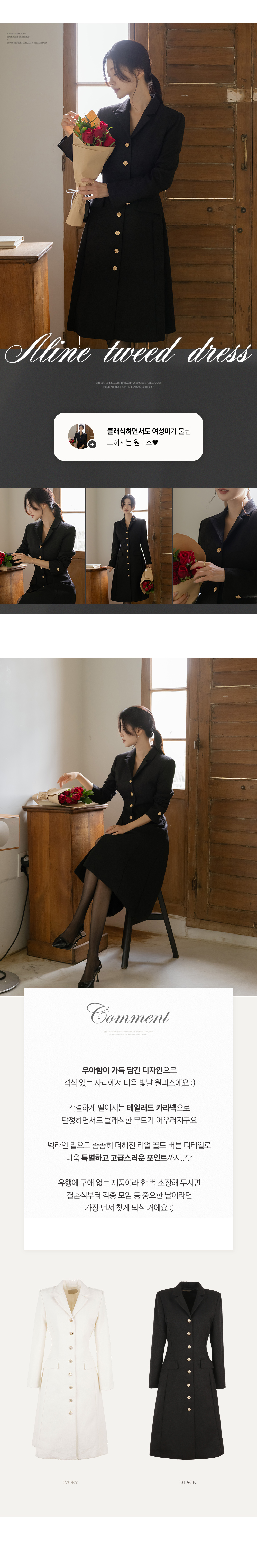 カラーネック ゴールドボタン Aライン ツイード ワンピース