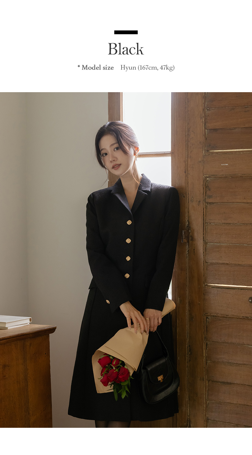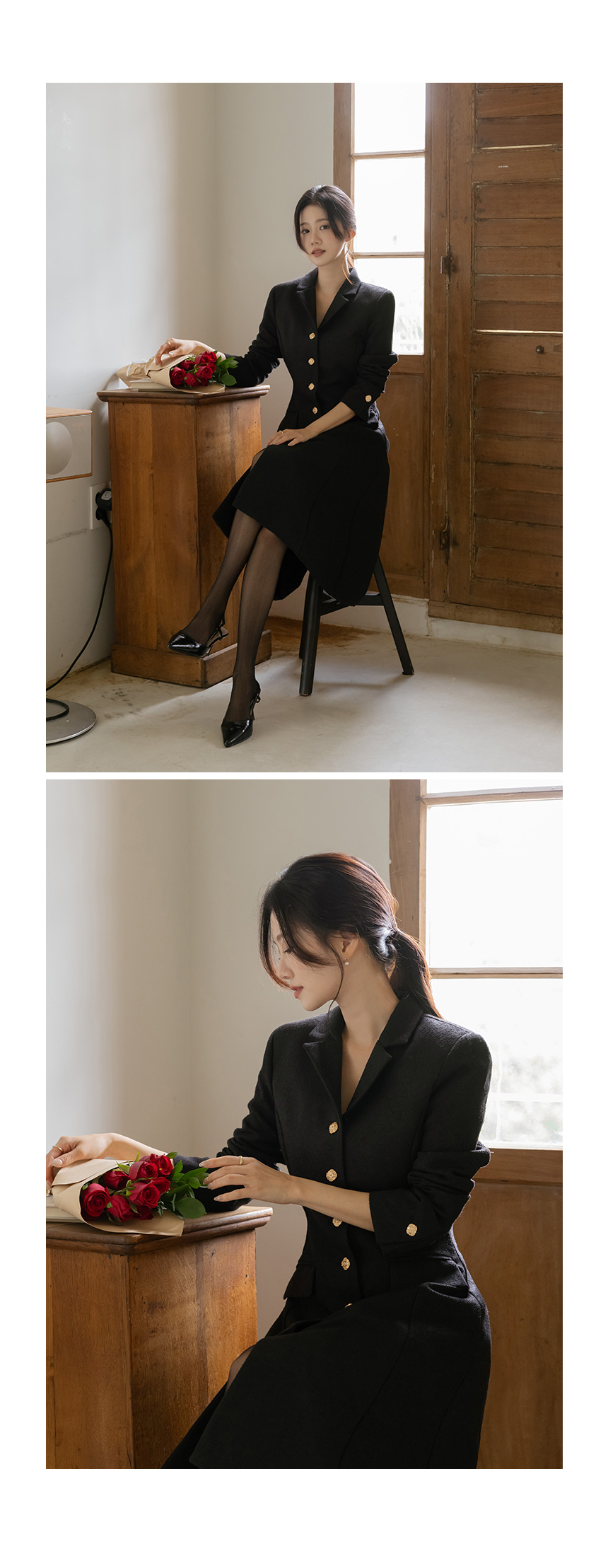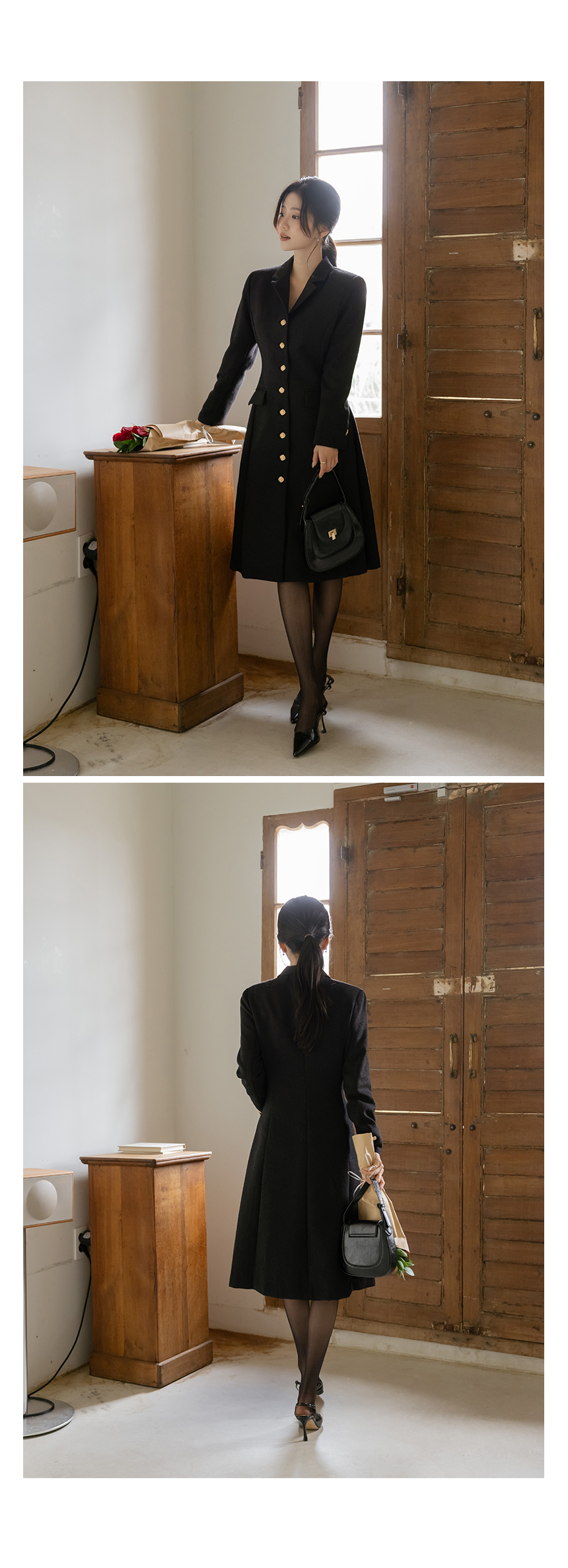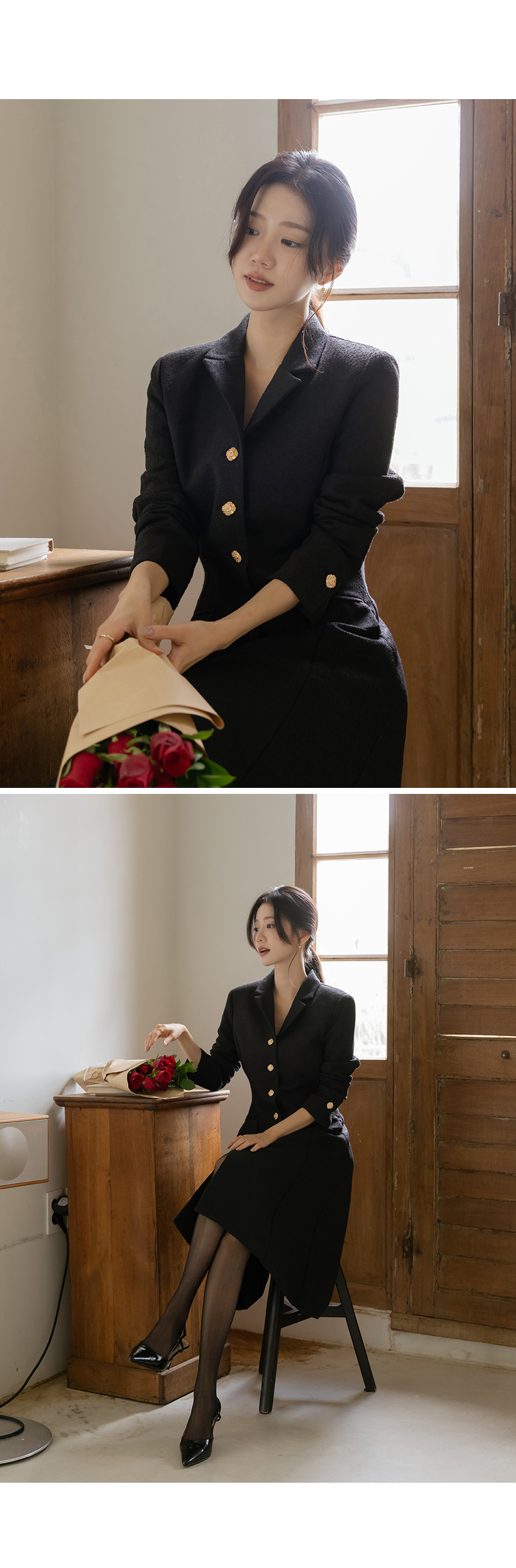 カラーネック ゴールドボタン Aライン ツイード ワンピース
