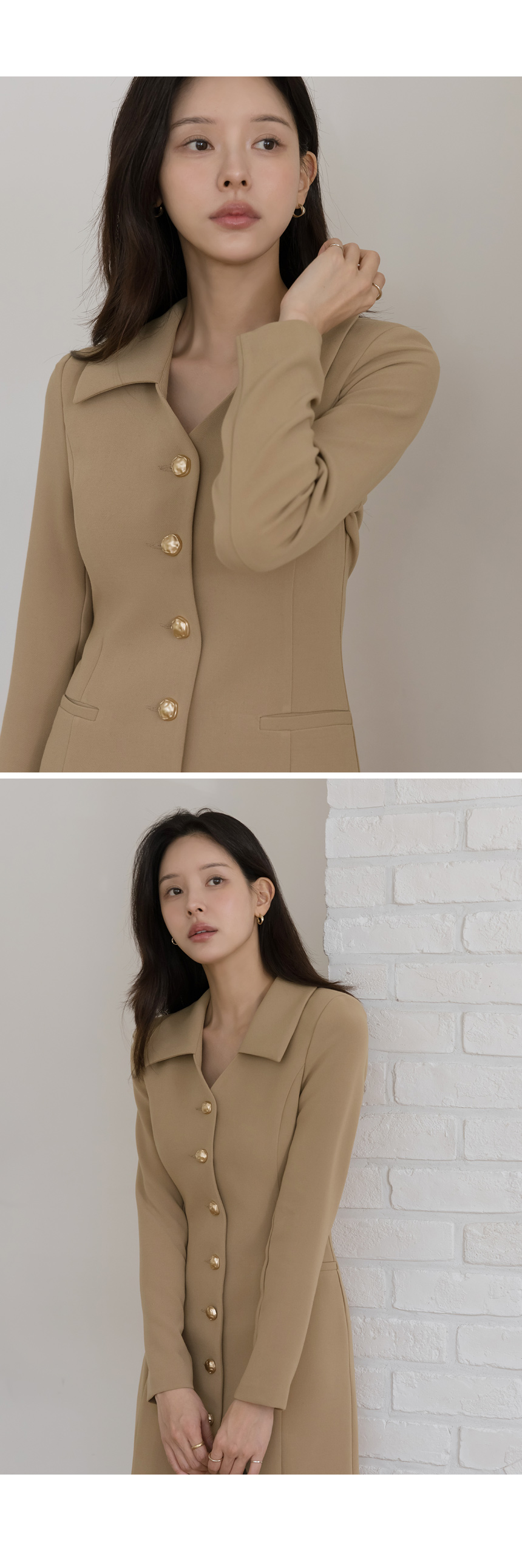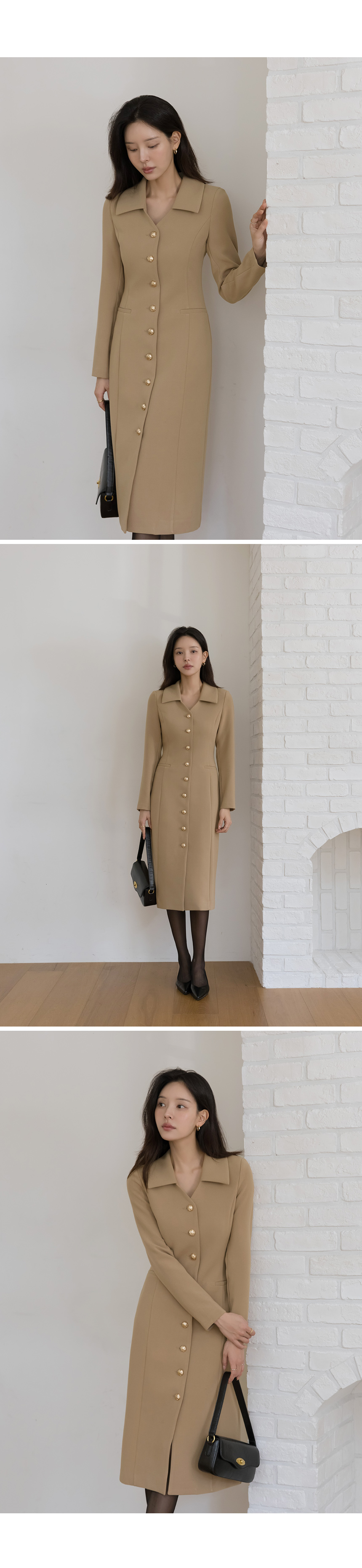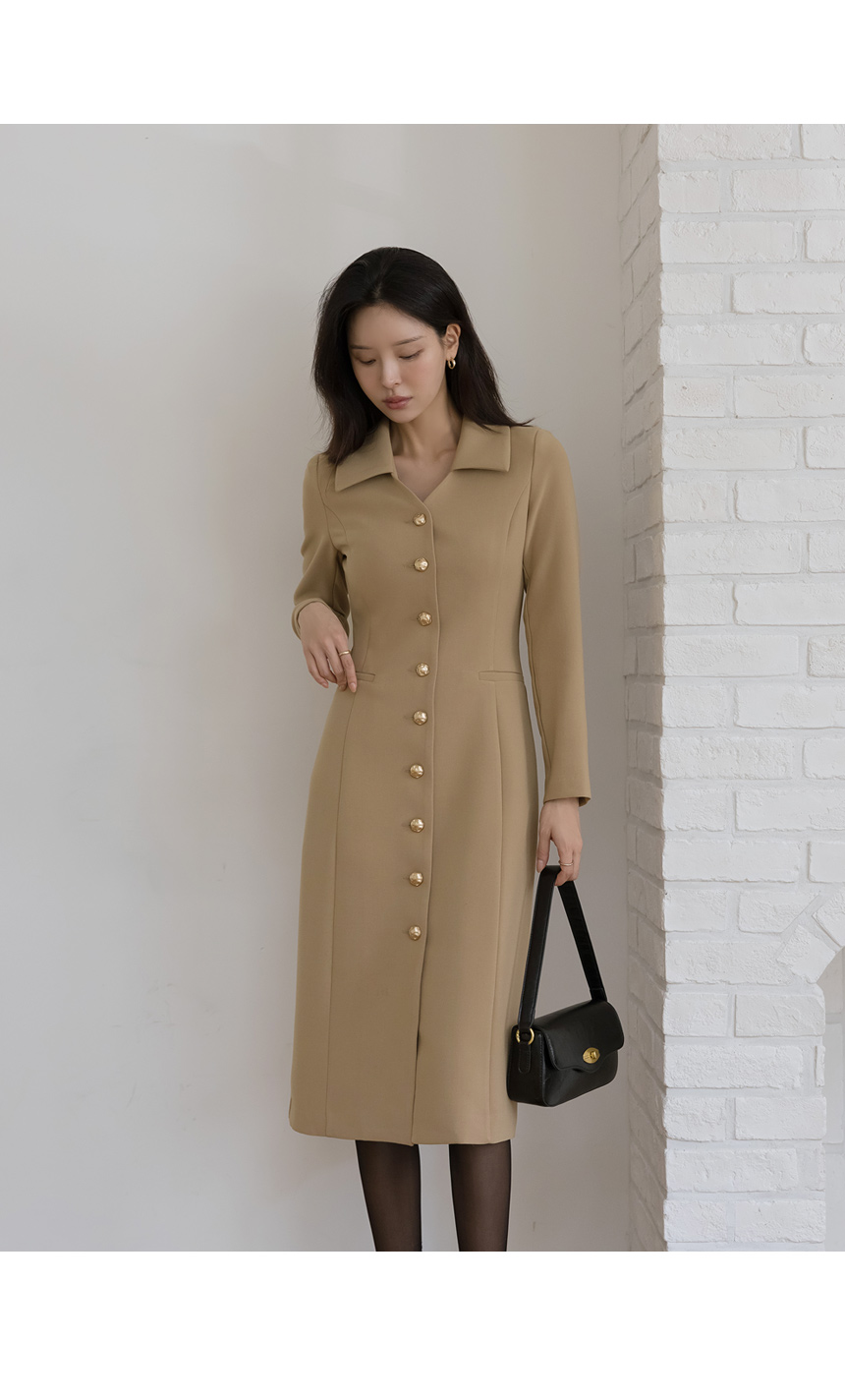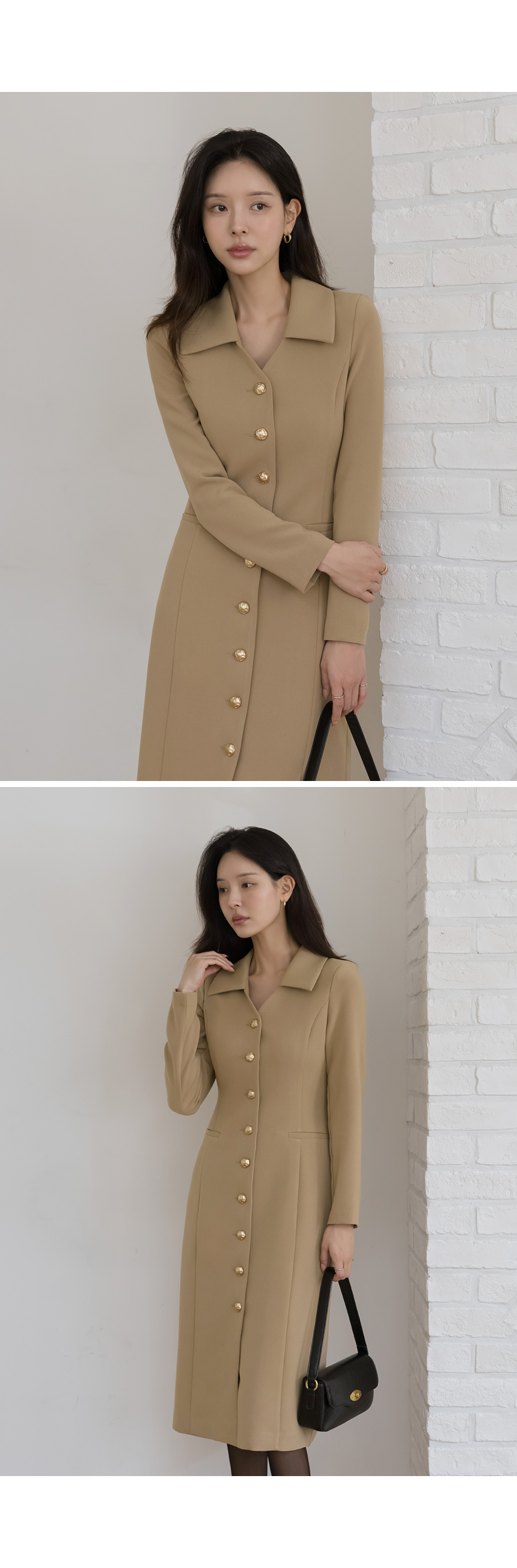 カラー 切開ネック ゴールド ボタン Hライン ワンピース