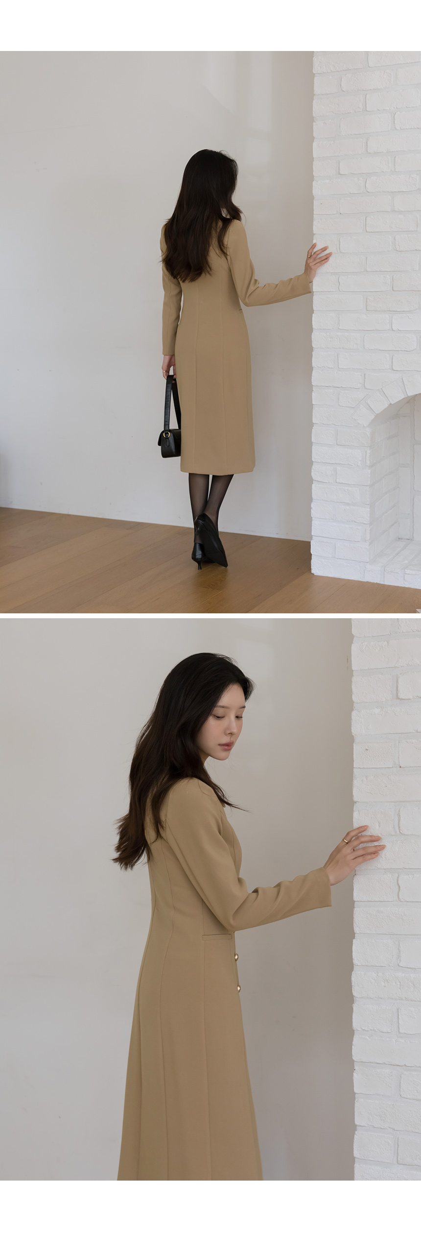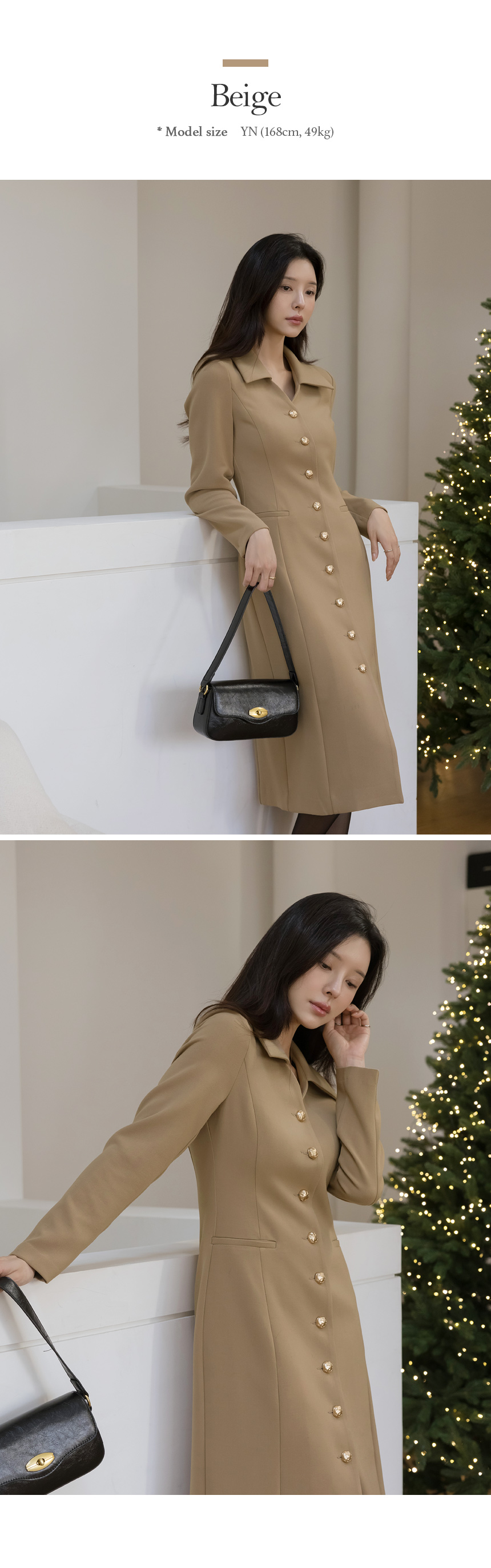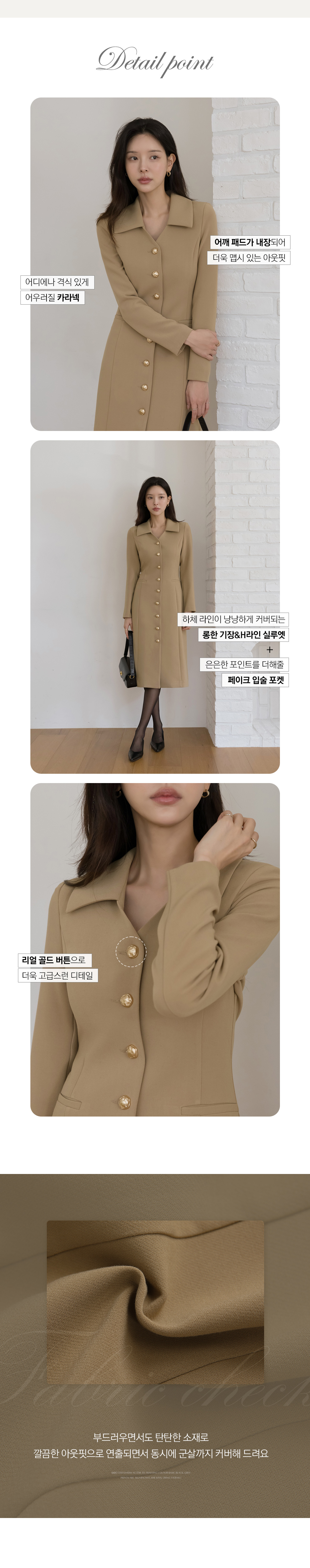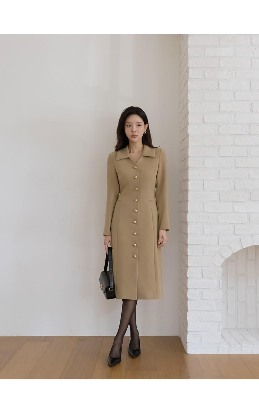 カラー 切開ネック ゴールド ボタン Hライン ワンピース
