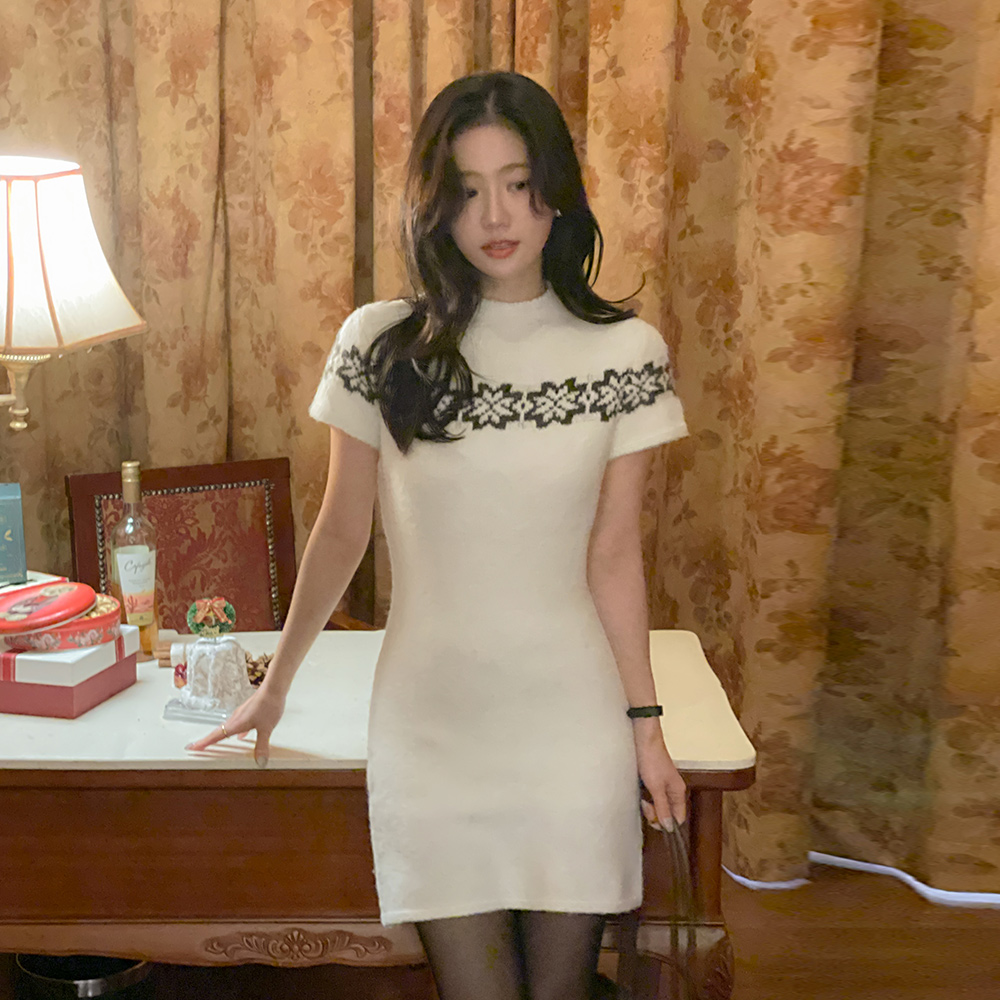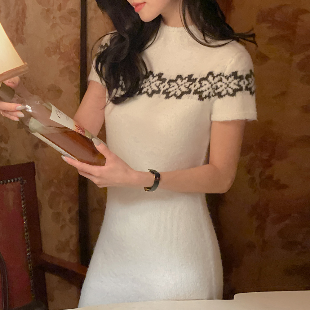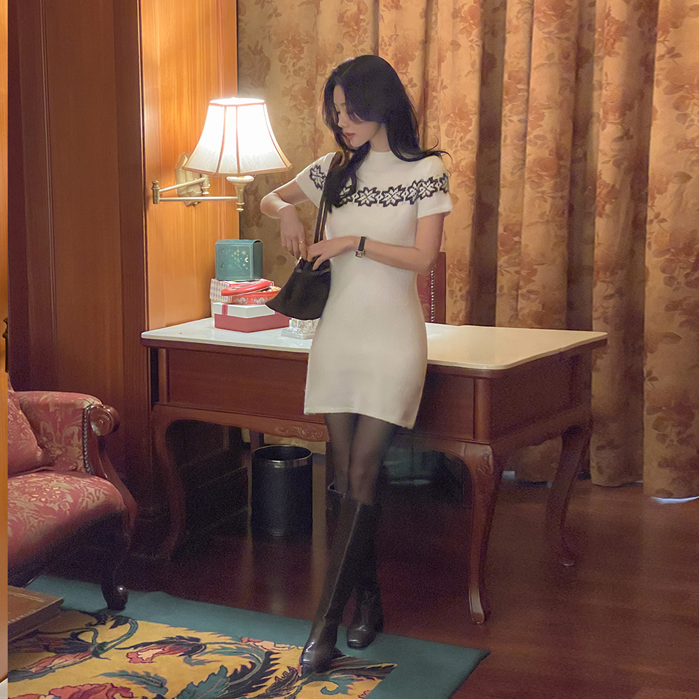 ハーフネック 雪花 ウール ニット ミニ ワンピース