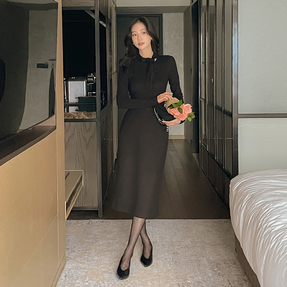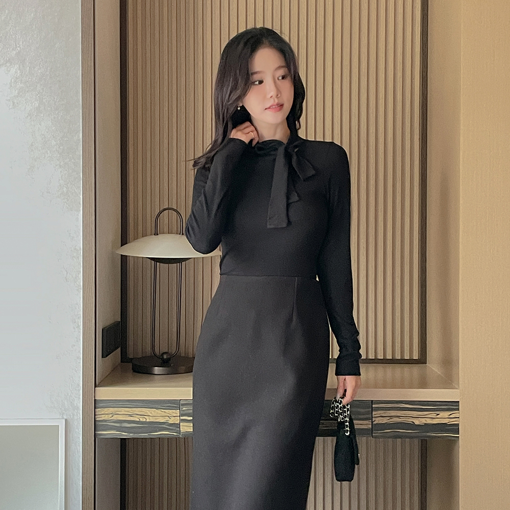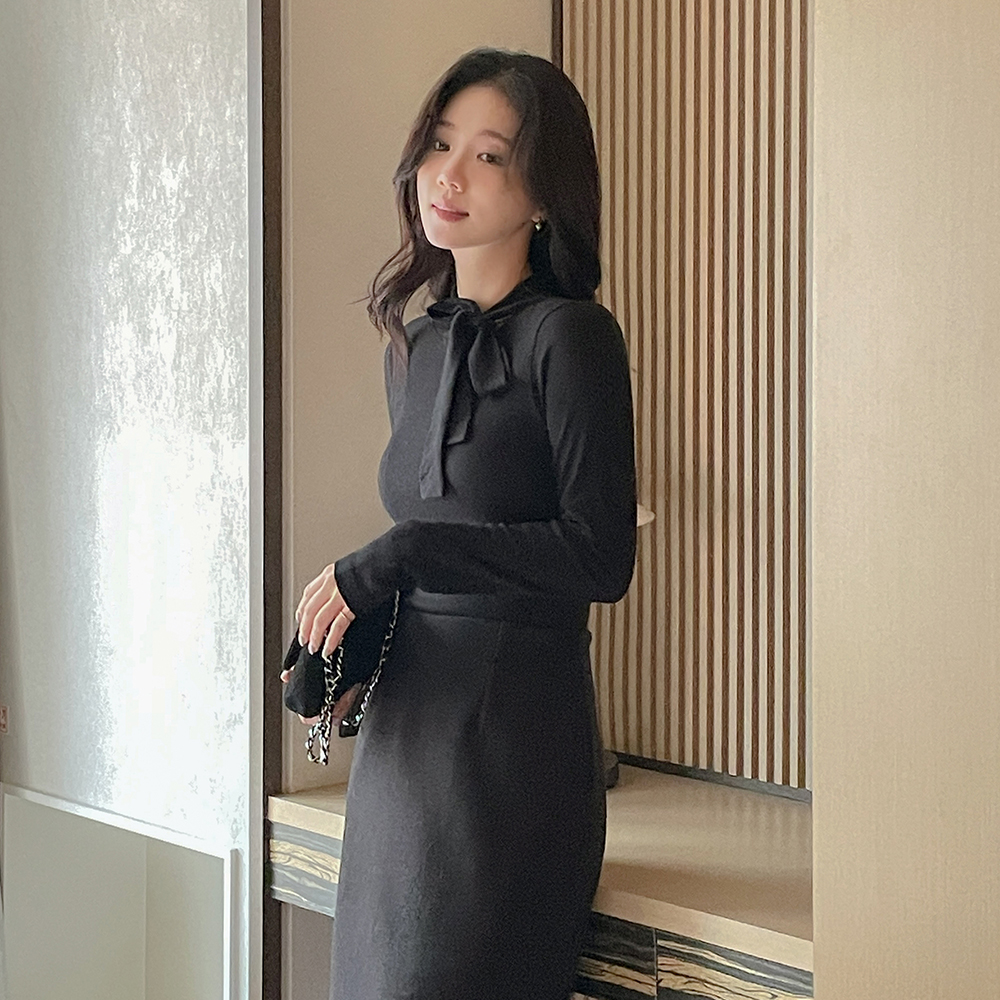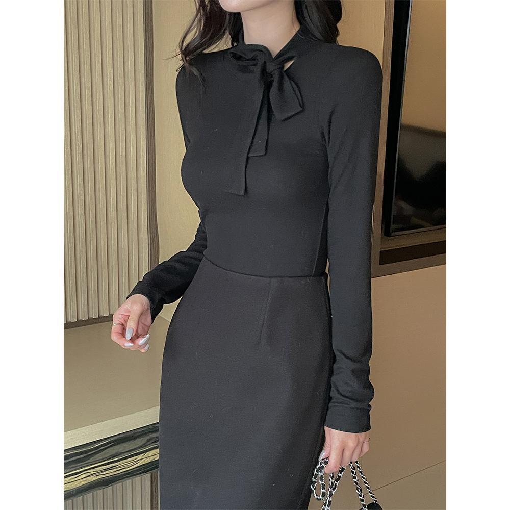 リボン·ネックライン 겉기모 弾力 ティーシャツ