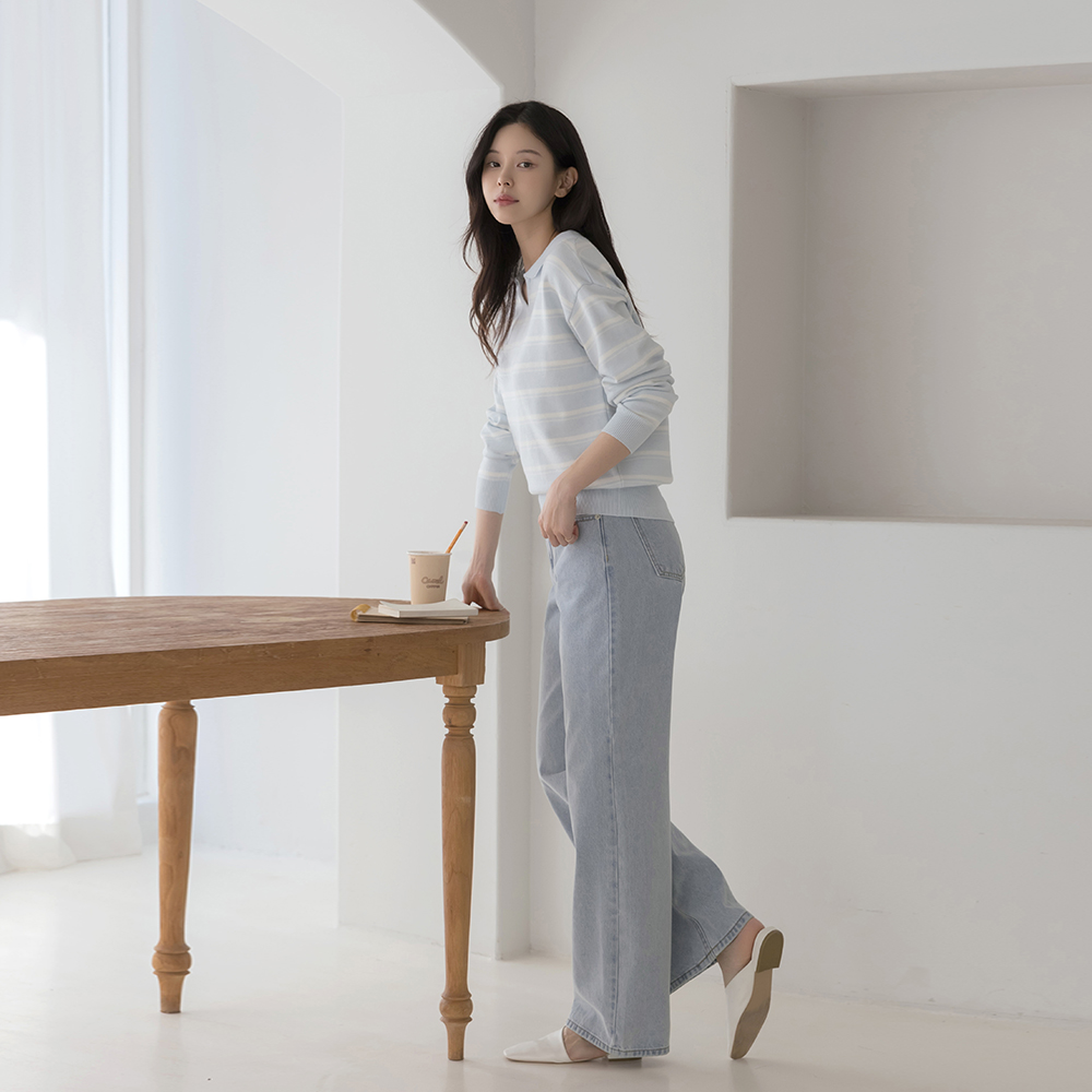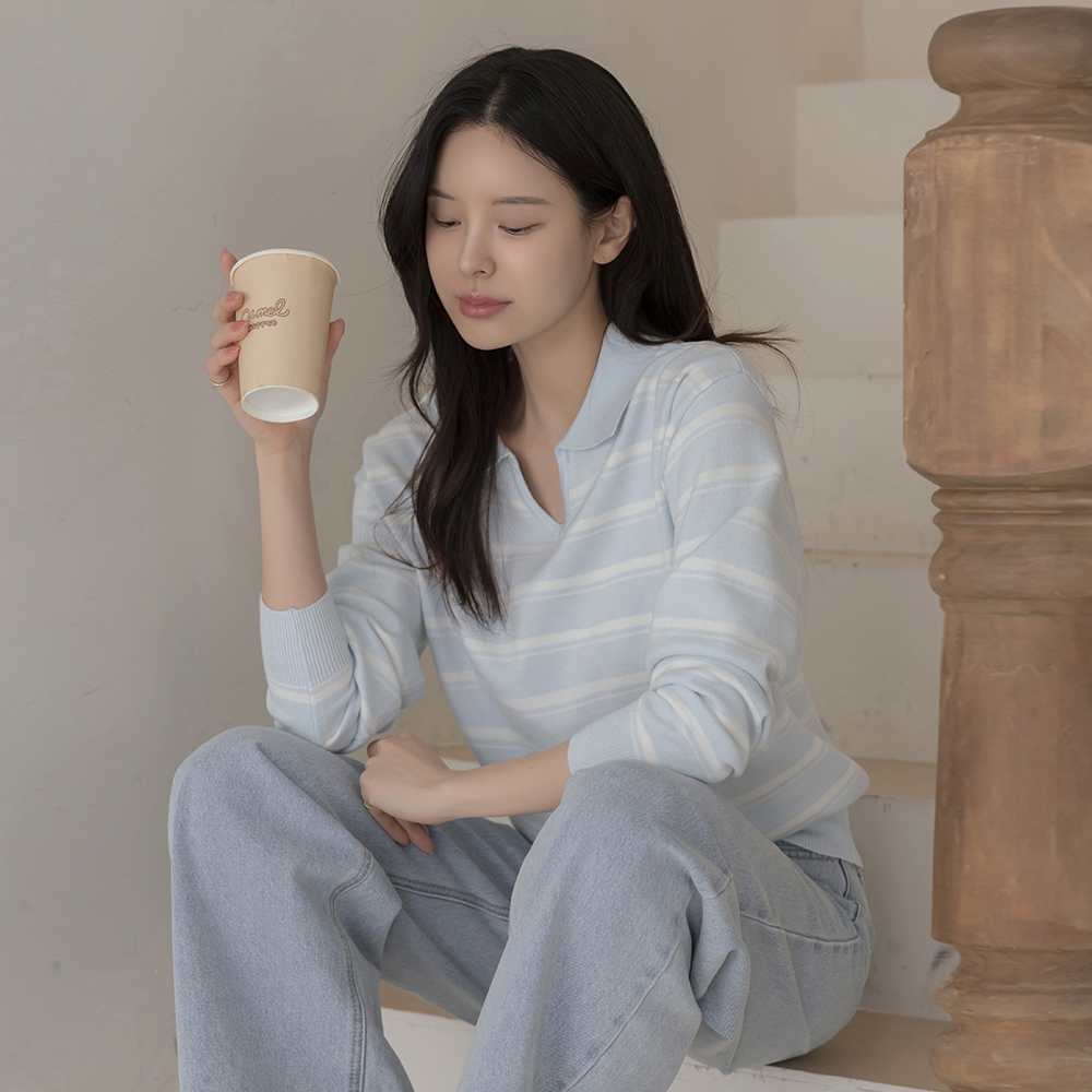 キャンデー カラー 切開ネック ストライプ ニット