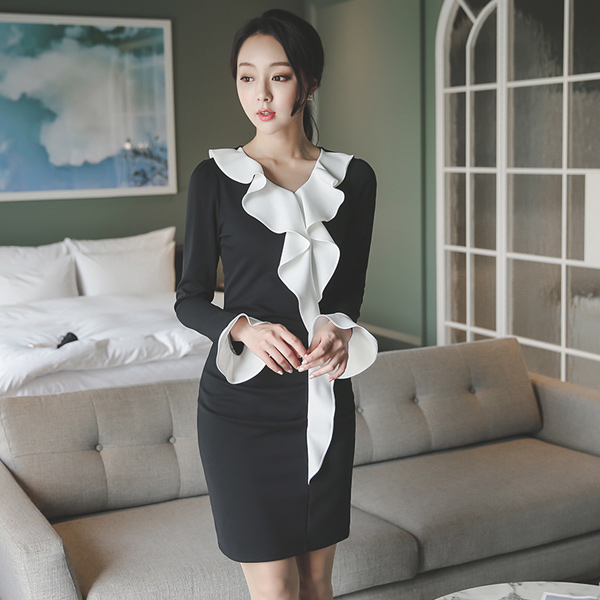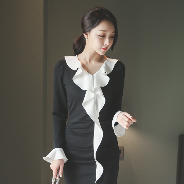 ブラックアンドホワイト フラウンス シャーリング ワンピース