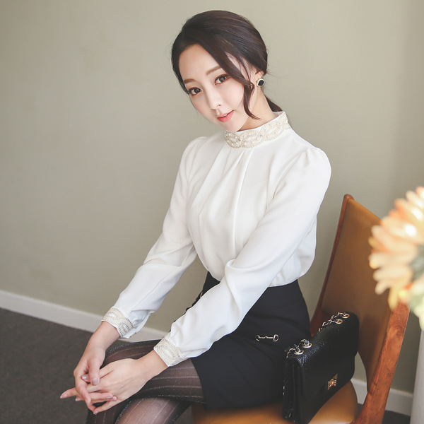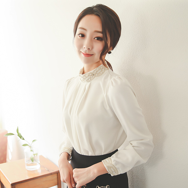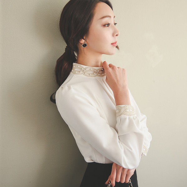 ゴールド刺繍真珠ネックシャーリングブラウス