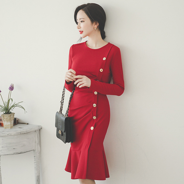 ゴールドボタンシャーリングマーメイドドレス