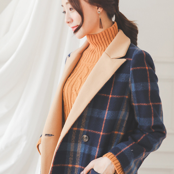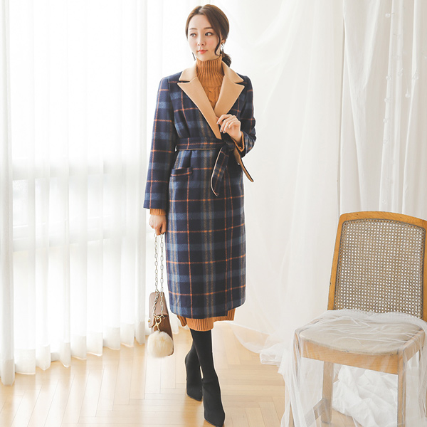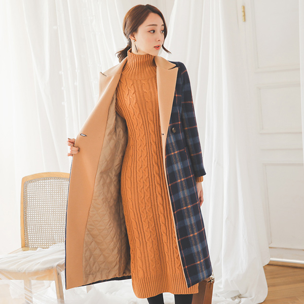 カラー配色テイラータータンチェックロングウールコート