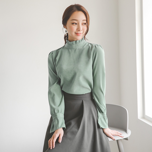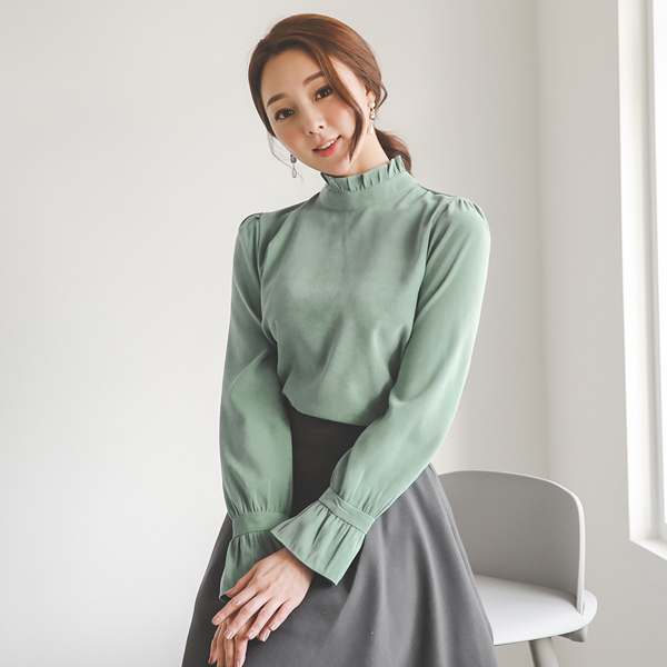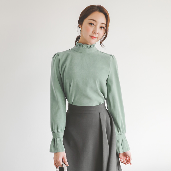 ロマンチック プリルネック&カフス スエード ブラウス
