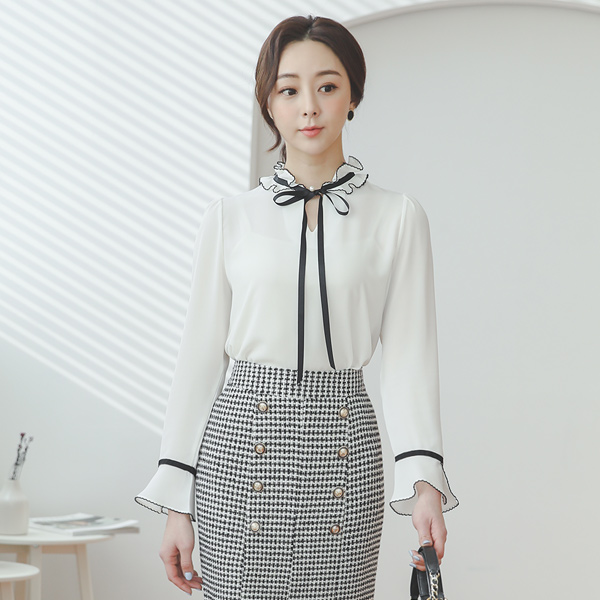 刺繍フリル 真珠タイ 切開ネック ブラウス