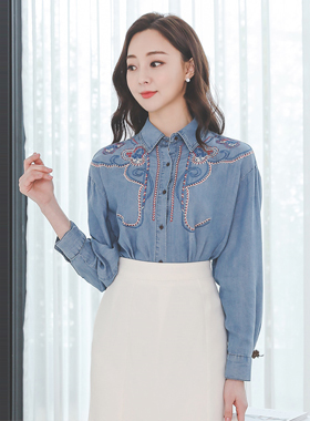 はいしょく 花模様 アンティーク刺繍 デニム シャツ