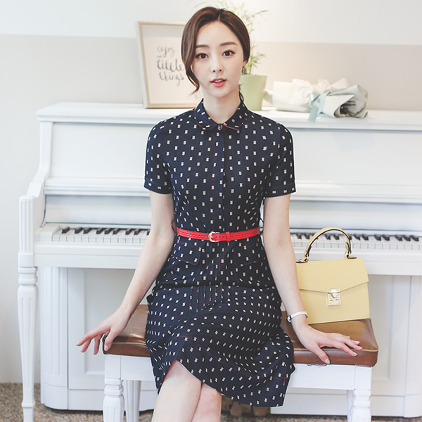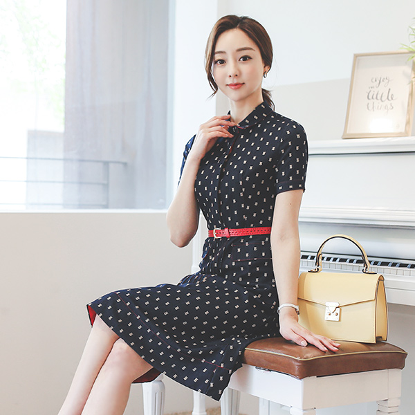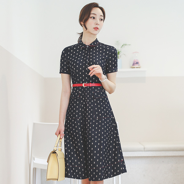 グロッシー デニム ベルティード フレア ワンピース