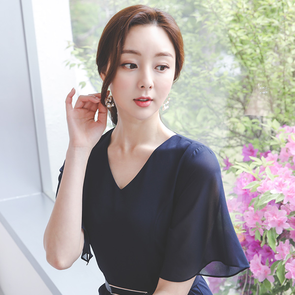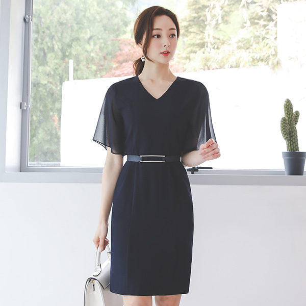 シフォン パピヨンスリープ シルバーバー ブイネック ワンピース