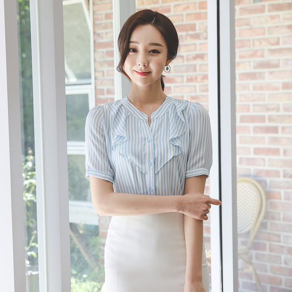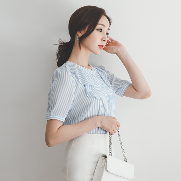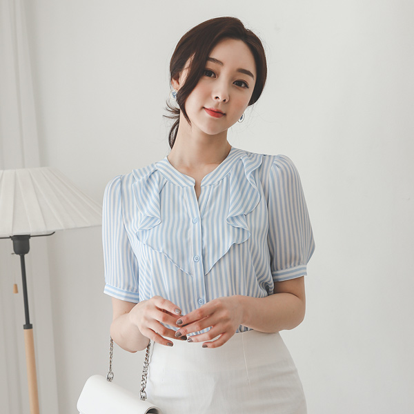 ストライプ プリルネック 半袖 チャイナ ブラウス