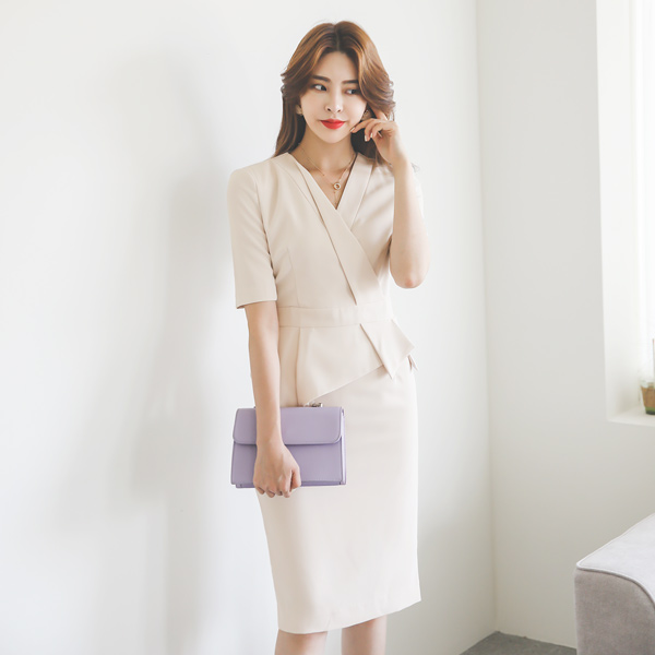 Pelisse ブイネック ペプラム 弾力 ワンピース