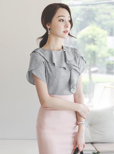 真珠 ラッフルライン チューリップ袖 ボカシ ブラウス