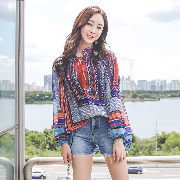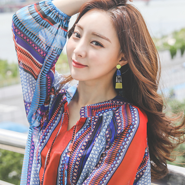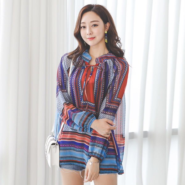 ビビッド エスニック パタン チャイナ ロングブラウス