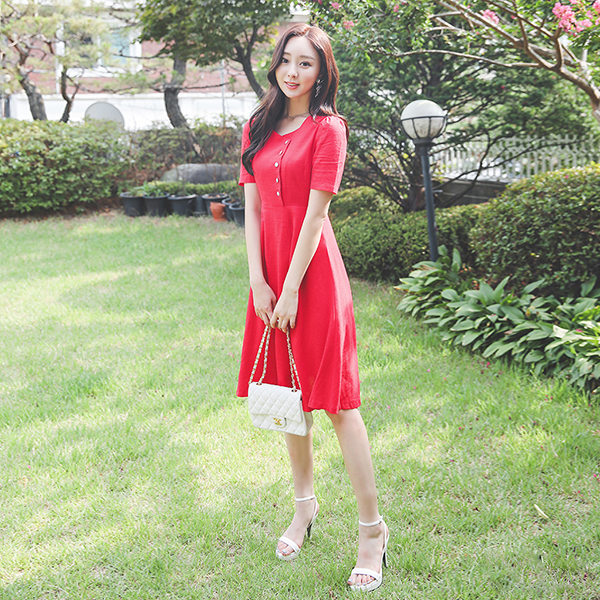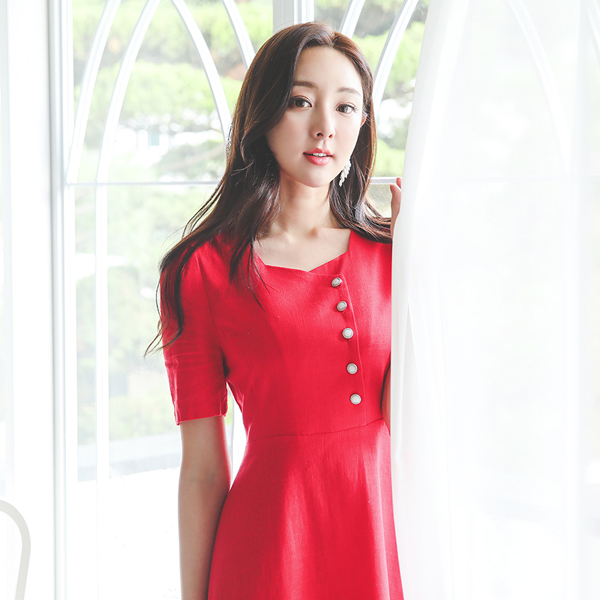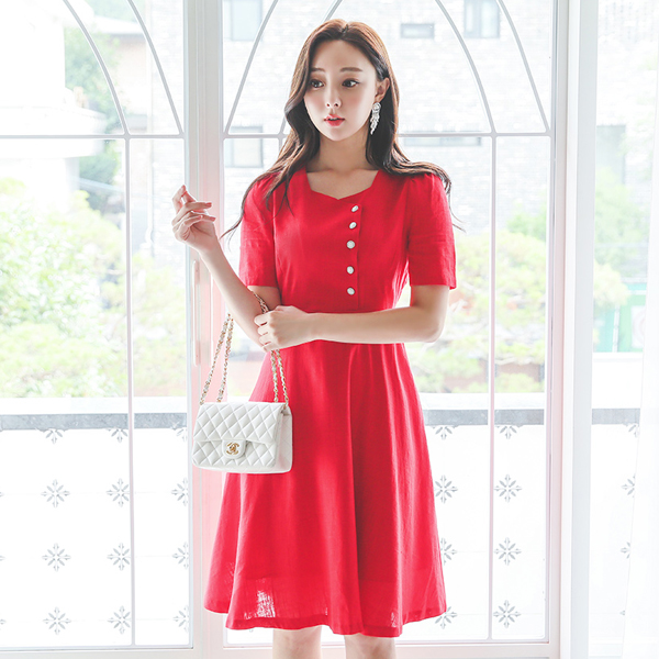 スクエアネック ボタン ポイント Aライン リネン ワンピース