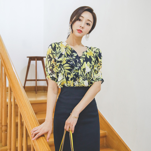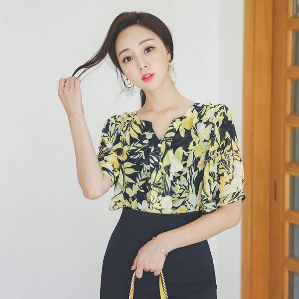 ビビッド 花柄 捺染 豆ボタン シフォン ブラウス