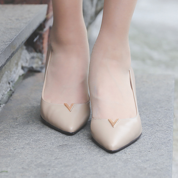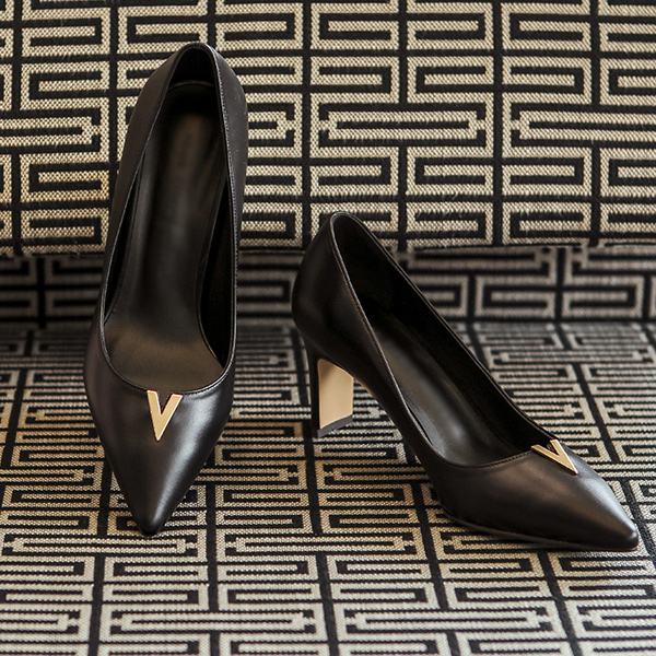 カーフスキン エッジ V ゴールドバー装飾 パンプスヒール